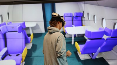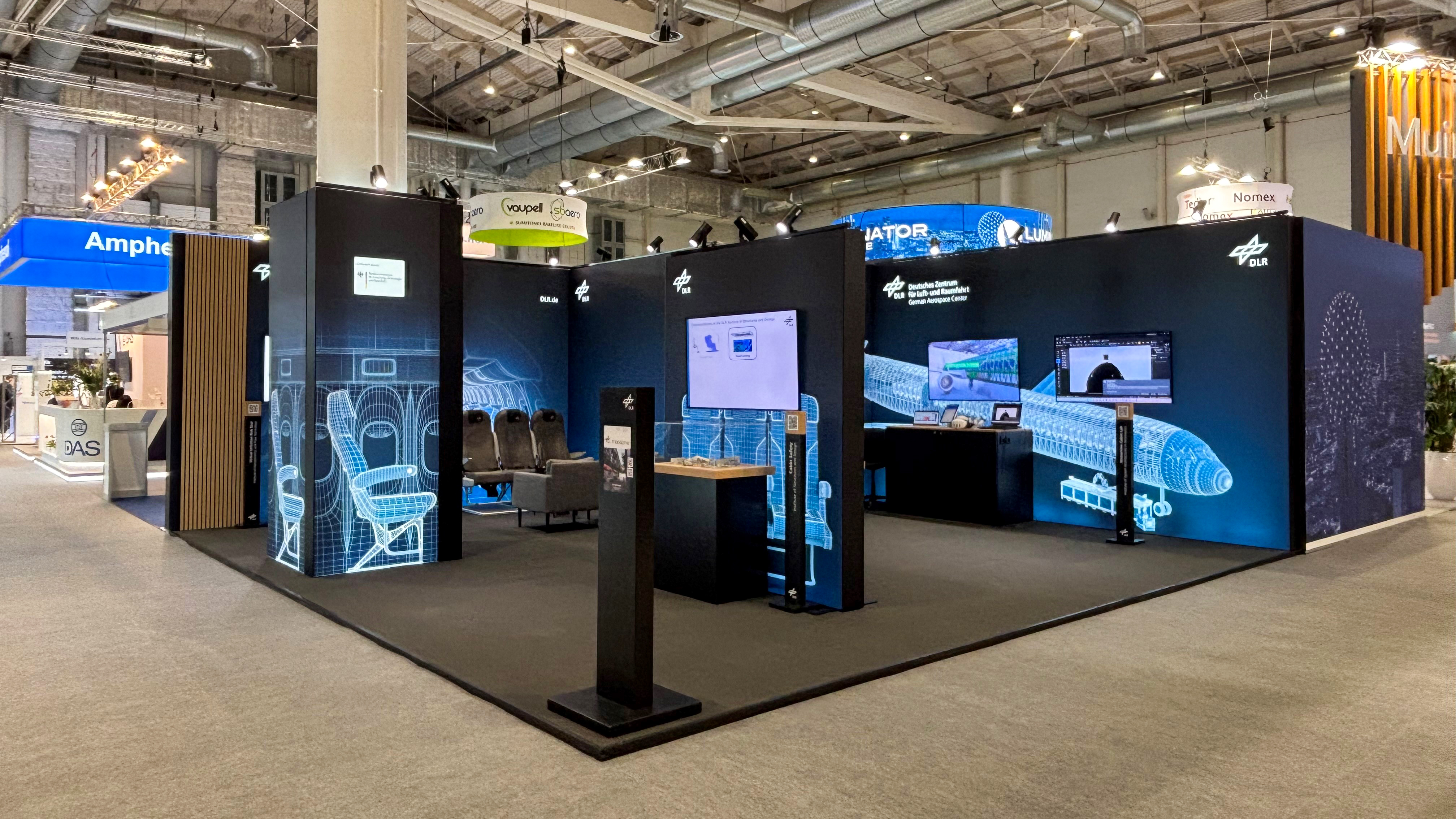 Messebesuchende können im vorderen Bereich einer virtuellen Kabinenumgebung eintauchen, um die am DLR entwickelten nutzerzentrierten und kollaborativen Entwurfsmethodiken hautnah zu erleben. Ein modularer Baukasten aus Sitz- und Tischmodellen erlaubt es, das Design gemeinsam mit Unterstützung von Expertinnen und Experten selbst in Echtzeit zu gestalten und virtuell zu testen.