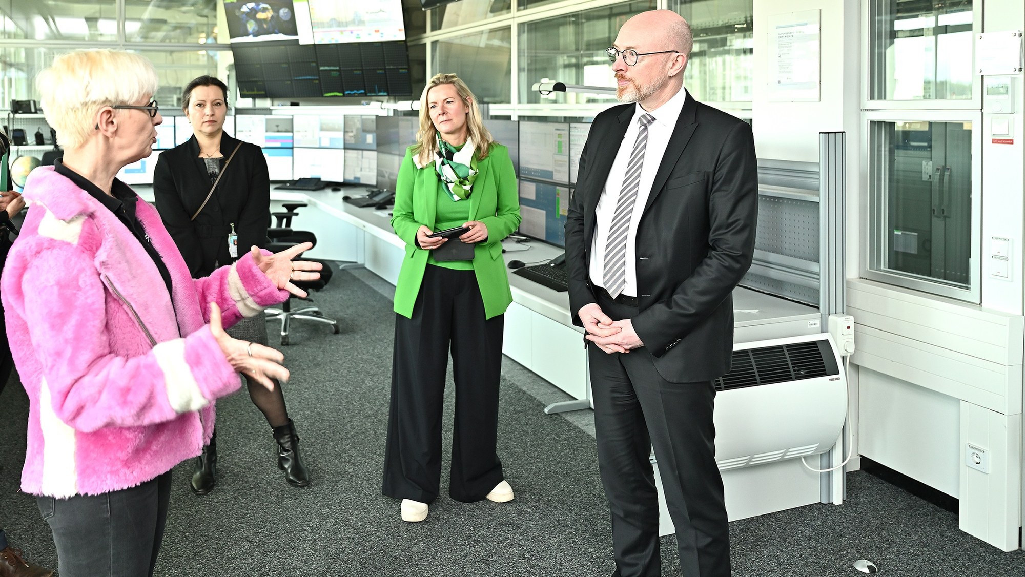 Von links: Prof. Dr.-Ing. Anke Kaysser-Pyzalla, Vorstandsvorsitzende des DLR, Maria Reulke, Leiterin der DLR-Standorte der Region Ost, Mareike Donath, Leiterin der Stabsstelle Digitaler Wandel, Christian Pegel, Minister für Inneres, Bau und Digitalisierung des Landes Mecklenburg-Vorpommern.