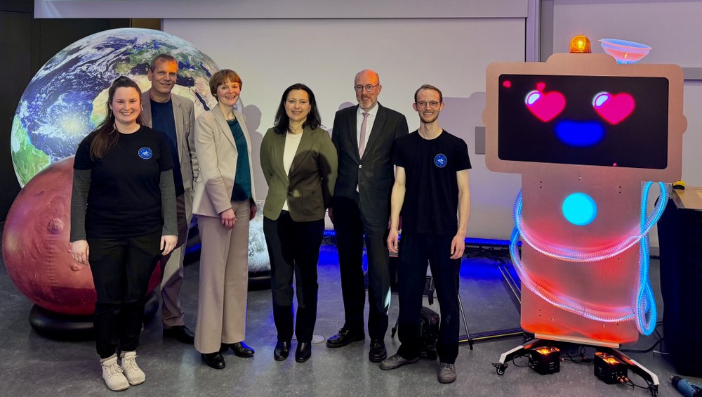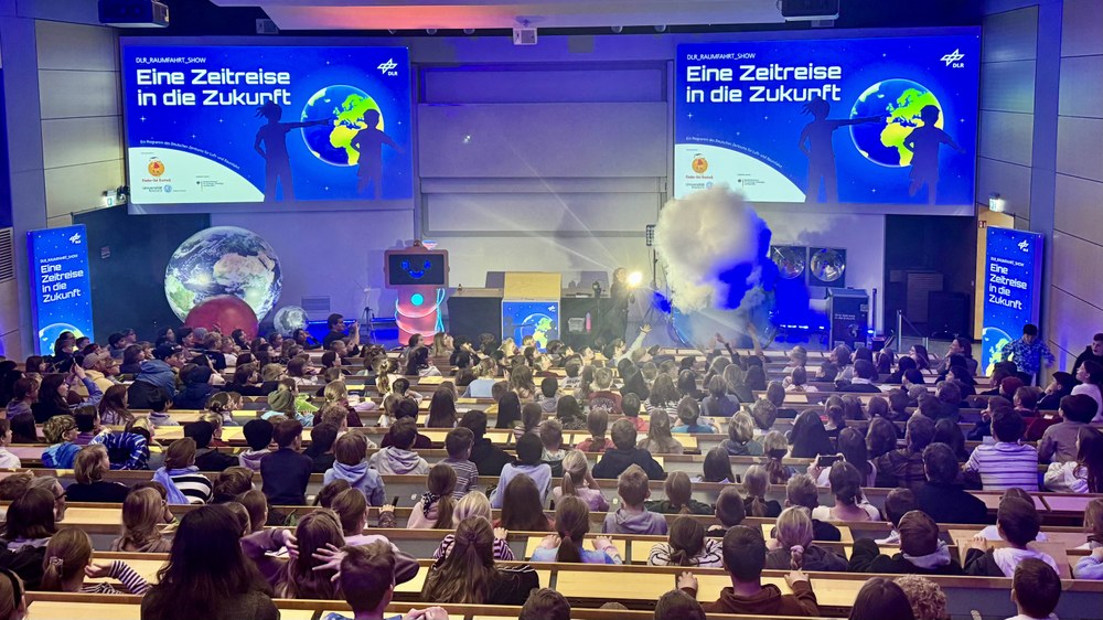 Am 24. und 25. März 2026 brachte die DLR_Raumfahrt_Show die Faszination der Raumfahrt nach Rostock. Unter dem Motto „Eine Zeitreise in die Zukunft“ erlebten insgesamt 2.000 Schülerinnen und Schüler, Lehrkräfte sowie Familien im Audimax der Universität Rostock verblüffende Experimente, beeindruckende Bilder der Erde auf Großbildleinwand und spannende Videos. Fragen nach zukünftigen Weltraum-Hotels oder Forschungsstationen auf dem Mond oder Mars beflügelten die Fantasie des Publikums, das zudem aktiv in das Programm eingebunden wurde.