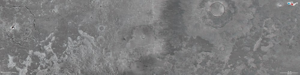 Die linke Seite des Bildes zeigt ein markantes Merkmal des Utopia-Beckens: Gräben von bis zu zwei Kilometer Breite und 20 Kilometer Länge überschneiden sich und bilden dadurch ein polygonales Muster. Sie sind auch in der Mitte des Bildes zu sehen, aber erscheinen dort „verblasst“ und zeigen keine klaren Grenzen wie die Gräben auf der linken Seite. Das könnte daran liegen, dass die Vertiefungen von anderen Materialien aufgefüllt wurden oder von Anfang an nicht sehr tief waren.