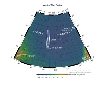 Auf der Nordhalbkugel des Mars liegt das riesige Einschlagsbecken Utopia Planitia. Hier befinden sich beachtliche Mengen an Wassereis unter der Oberfläche, deshalb ist es für die Marsforschung von großem Interesse. Auf neuen Bildern der DLR-Marskamera HRSC sind besonders viele typische Landformen zu erkennen, die auf das Vorhandensein solcher unterirdischer Eisvorkommen hinweisen. HRSC ist ein Kameraexperiment an Bord der Raumsonde Mars Express, das vom Deutschen Zentrum für Luft- und Raumfahrt (DLR) entwickelt wurde und seit 2004 betrieben wird.