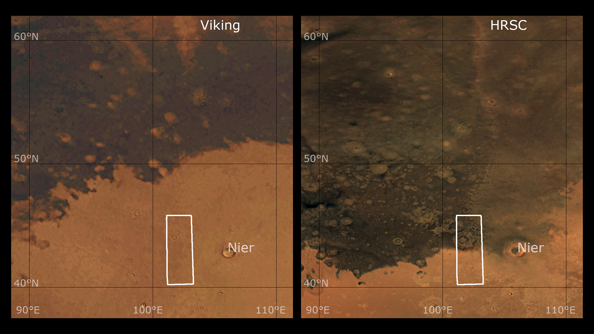 Die Bilder wurden von der HRSC (High Resolution Stereo Camera) am 9. November 2024 während Mars Express Orbit 26.327 aufgenommen. Die Bodenauflösung beträgt etwa 17 Meter pro Pixel und das Bild ist auf etwa 43 Grad Nord und 102 Grad Ost zentriert. Das Farbbild wurde unter Verwendung von Daten aus dem Nadir-Kanal, dem senkrecht zur Marsoberfläche ausgerichteten Sichtfeld, und den Farbkanälen der HRSC erstellt. Die schrägen Perspektiven wurden aus dem digitalen Geländemodell, dem Nadir- und den Farbkanälen der HRSC generiert. Das Anaglyphenbild, das bei Betrachtung mit einer Rot-Blau- oder Rot-Grün-Brille einen dreidimensionalen Eindruck der Landschaft vermittelt, wurde aus dem Nadir-Kanal und einem Stereokanal abgeleitet. Die farbkodierte topografische Ansicht basiert auf einem digitalen Geländemodell der Region, aus dem die Topografie der Landschaft abgeleitet werden kann. |