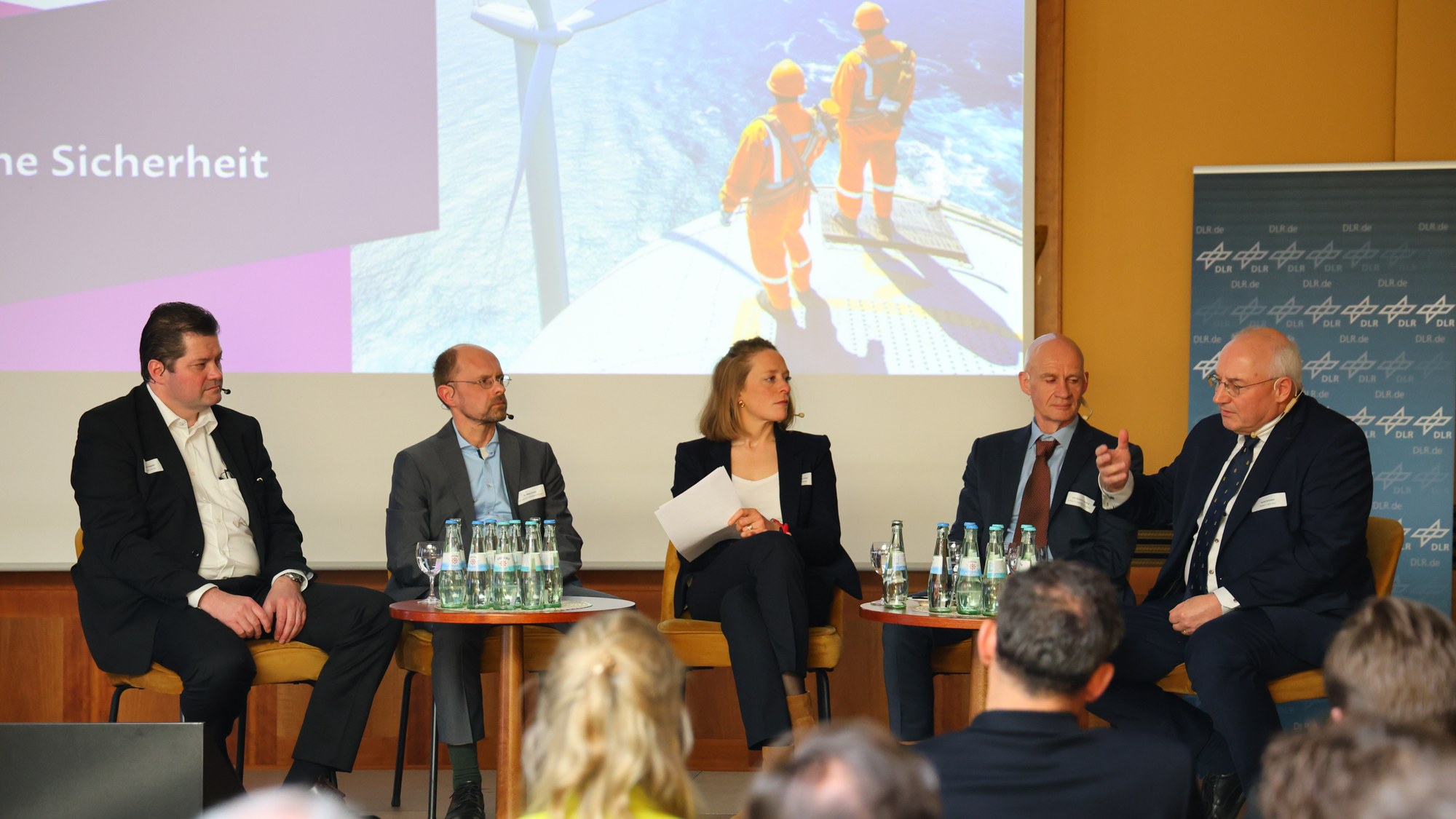 Von links: Dr. Carsten Hilgenfeld, Geschäftsführer der JDS GmbH, Dr. Stefan Gewies, DLR-Institut für Kommunikation und Navigation, Lotta Polter, Journalistin, Jens Schröder-Fürstenberg, Leiter Nautischer Informationsdienst im BSH, Harald Schlotfeldt ,Technischer Direktor der Reederei F. Laeisz GmbH