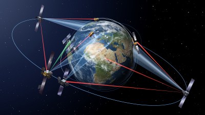 In der künstlerischen Darstellung werden Erdbeobachtungsdaten von Satelliten des Copernicus-Programms mit Hilfe von EDRS zur Erde übermittelt. Durch die "Laser Communication Terminals" (LCT) ist das EDRS-System in der Lage, Daten in mit sehr hoher Geschwindigkeit zu übertragen.