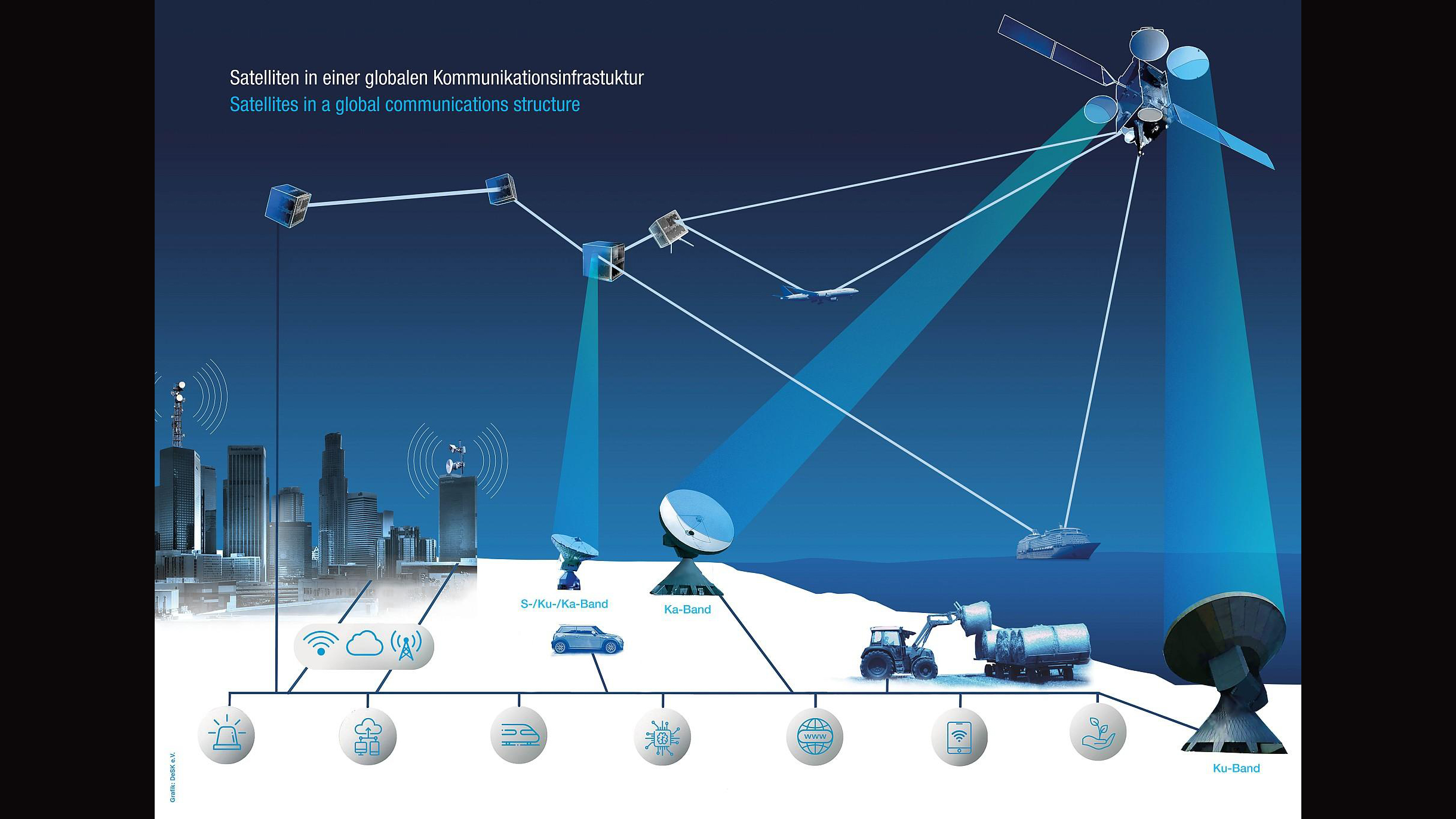 Die Satellitenkommunikation erfüllt wichtige gesellschaftliche und hoheitsrechtliche Aufgaben und bietet fast weltweite Signalabdeckung durch geostationäre Satelliten.