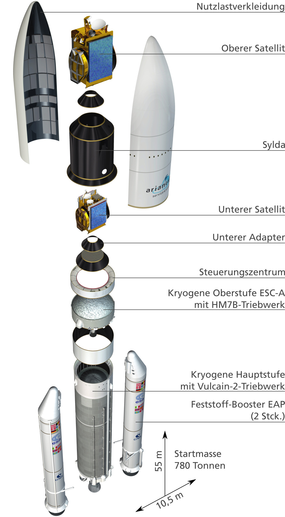 Feststoff-Booster EAP | Kryogene Hauptstufe EPC | Kryogene Oberstufe ESC-A | |