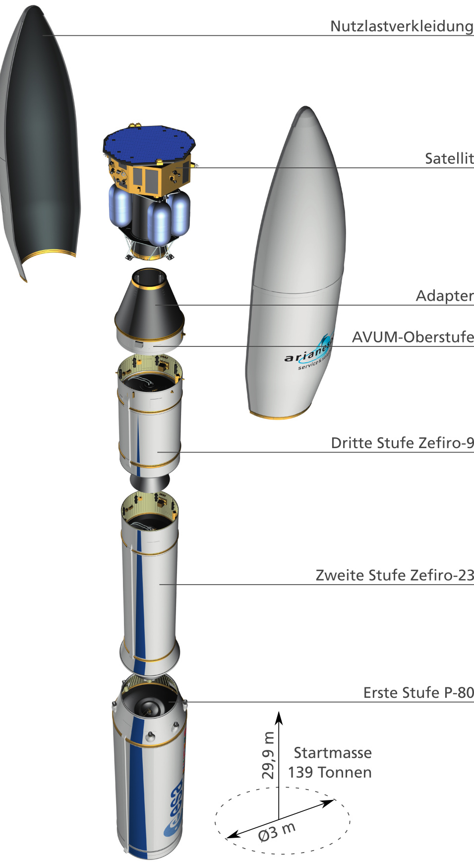 Mit rund 30 Metern Länge und einem Durchmesser von drei Metern ist Vega Die kleinste der drei ESA-Trägerraketen. Bei einem Gesamtgewicht von rund 139 Tonnen kann das System bis zu 2,5 Tonnen Nutzlast transportieren. VEGA wurde konzipiert, um vor allem kleinere Forschungs- und Erdbeobachtungssatelliten in polare oder niedrige Erdumlaufbahnen zu transportieren. Dabei besitzt Vega gegenüber den meisten anderen Kleinraketen einen entscheidenden Vorteil: Mit jedem Start können gleich mehrere Satelliten in unterschiedliche Orbits gebracht werden.