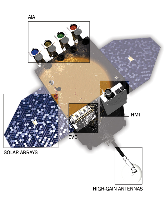 Der SDO-Satellit benutzt für seine Sonnenbeobachtungen drei Instrumente. Das Instrument „Helioseismic and Magnetic Imager“ (HMI) beobachtet vergleichbar einem Ultraschallgerät das Sonneninnere und die von der Erde aus unsichtbare Rückseite der Sonne. Die Wechselwirkung zwischen den Aktivitäten des Sonnenmagnetfelds und der Energiefreisetzungsprozesse in der Sonnenkorona untersucht das Instrument „Atmospheric Imaging Assembly“ (AIA), während das Instrument „Extreme Ultraviolet Variability Experiment“ (EVE), kontinuierlich die Veränderungen der Sonnenstrahlung im extremen Ultraviolettbereich misst.