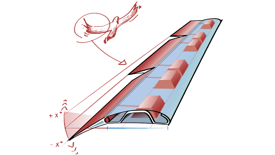 Eine große Herausforderung für die Wissenschaftlerinnen und Wissenschaftler stellt die Auslegung des Steuerflächensystems an der Hinterkante dar: Neben den klassischen Anforderungen an den Hochauftrieb für Start- und Landeleistung, muss es auch die mit der Flügelauslegung verbundenen hohen Anforderungen an die Manövrierbarkeit und die Rollsteuerung erfüllen. Zudem sind innovative Materialien und Strukturbauweisen für die kleinen Bauhöhen im Außenflügelbereich erforderlich sowie eine kompakte Bauweise, die eine Integration von Aktuatoren und Kinematiken in die Steuerflächenkörper ermöglicht.