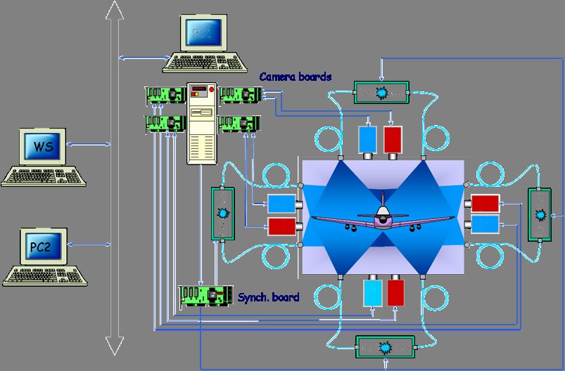 Für jede Beobachtungsrichtung stand eine UV-Lichtquelle zur Verfügung. Jede dieser UV-Lichtquellen war mit Lichtwellenleitern ausgerüstet. Acht CCD Kameras mit 12 bit Digitalisierungstiefe wurden zur Datenerfassung verwendet. In dieser Kombination von Lichtquellen und Kameras mit einem Beobachtungsabstand von einem Meter konnten Datenerfassungszeiten von typischerweise ca. 10 s realisiert werden. Ein Kamerapaar zur Detektion von Druck- und Referenzsignal kam zum Einsatz. Die eingesetzten optischen Filter vor den Kameras erfassen in unterschiedlichen Wellenlängen: einmal im Bereich 450-550 nm für das Drucksignal, das so genannte blaue Bild, zum anderen im Wellenlängenbereich von 600-650 nm für das Referenzsignal (Intensitäts-Monitoring), das so genannte rote Bild. Daher erfassen jeweils Kamerapaare für jede Beobachtungsrichtung die erforderlichen Bilder.