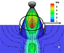Numerische Detached-Eddy-Simulation (DES) der Umströmung der Ariane-5-Trägerrakete in der Aufstiegsphase; Die vergrößerte Ansicht der Düse und der seitlichen Booster zeigt die zeitlich gemittelten Stromlinien und die dimensionslose Druckverteilung (im Feld und auf der Oberfläche).
