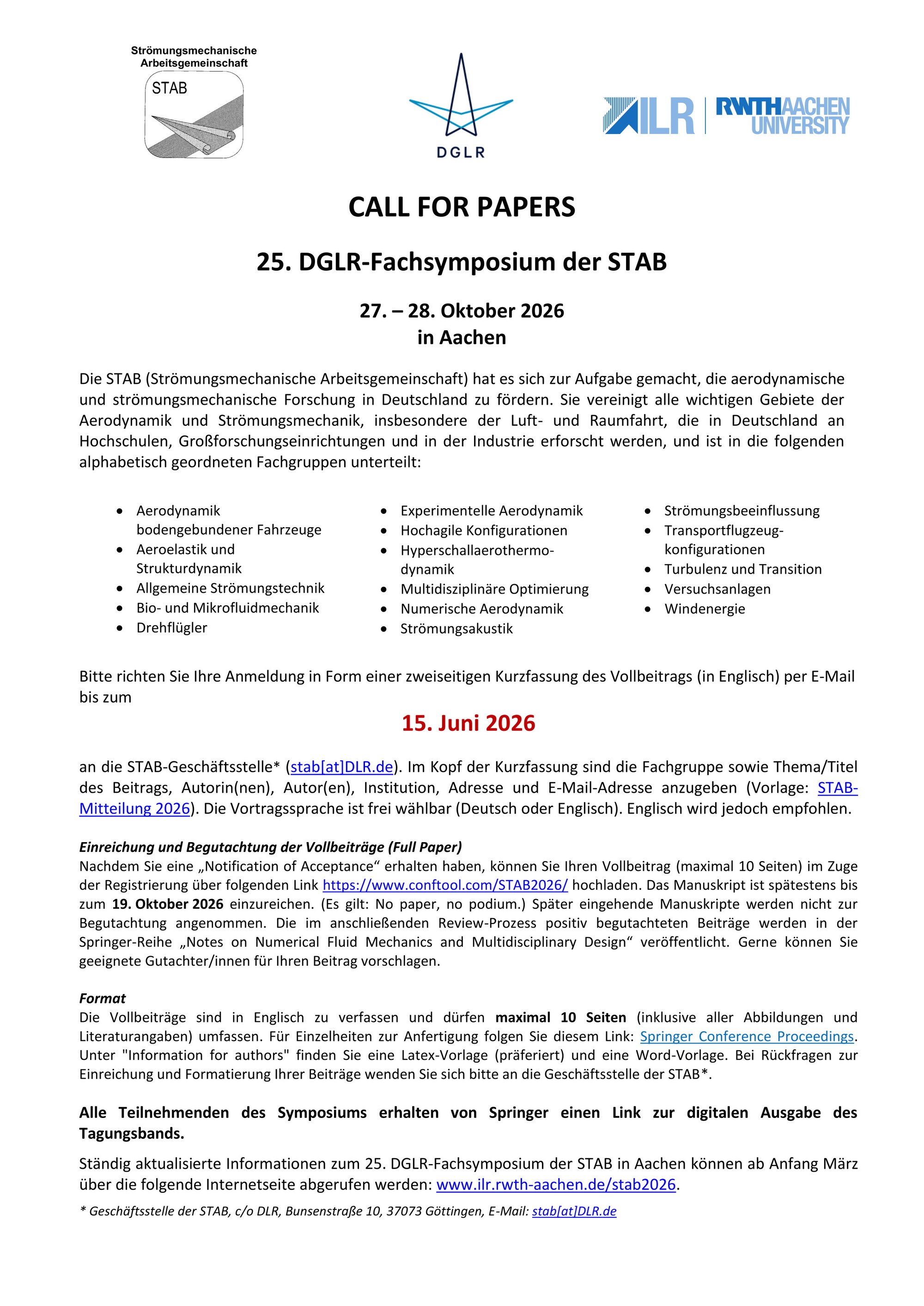 25. DGLR-Fachsymposium der STAB | Call for Papers