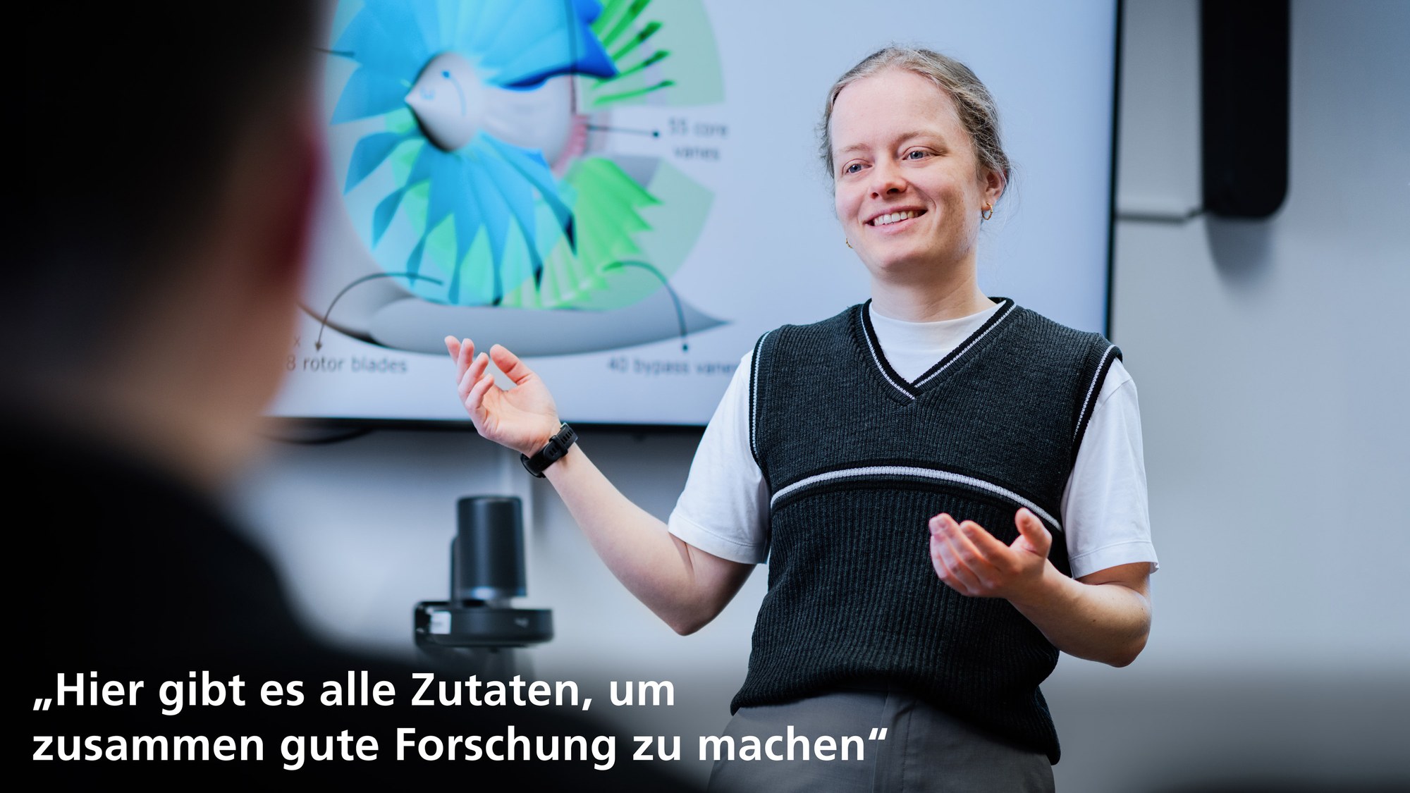 Auch schätzt sie die enge Zusammenarbeit im Team: „Das gibt es nicht immer, dass man mit seinen Kolleginnen und Kollegen auch so gut zusammenarbeiten kann“, erklärt die Wissenschaftlerin. Manchmal sei das Thema der Dissertation so speziell und individuell, dass die gar nicht so viel darüber wissen. „Aber so wie das Institut organisiert ist – und weil hier so viele verschiede Aspekte vom Triebwerk erforscht werden – hat man wirklich die Möglichkeit sich richtig viel auszutauschen“.