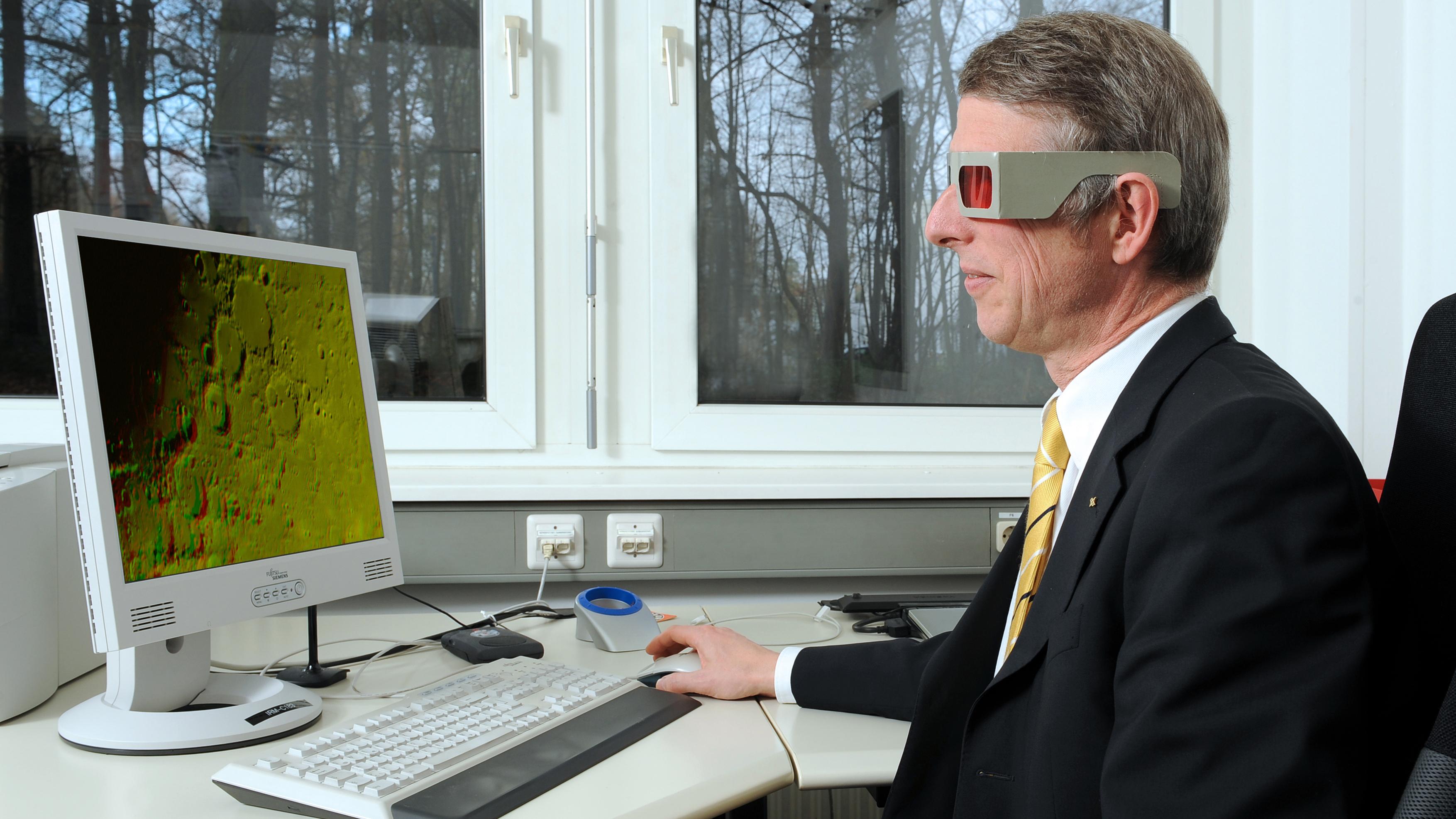 Immer wieder sucht sich Rolf Hempel, Leiter der Einrichtung "Simulations- und Softwaretechnik" im DLR, neue Herausforderungen für sein Hobby Astronomie. Mit der Grün-Rot-Brille betrachtet der 54-Jährige sein neuestes Werk: die Landestelle von Apollo 15 auf dem Mond in 3D.