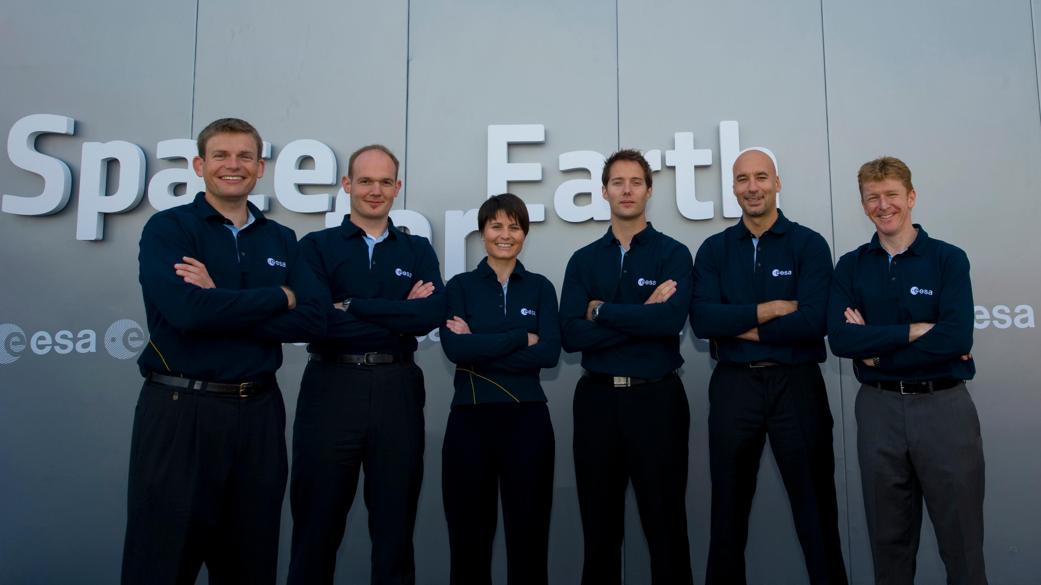 Die Astronauten-Grundausbildung wird Alexander Gerst zusammen mit seinen fünf Teamkollegen aus Frankreich, Italien, Großbritannien und Dänemark absolvieren (von links nach rechts: Andreas Mogensen, Alexander Gerst, Samantha Cristoforetti, Thomas Pesquet, Luca Parmitano, Timothy Peake). Das Foto entstand im Rahmen der Paris Air Show 2009 in Le Bourget.