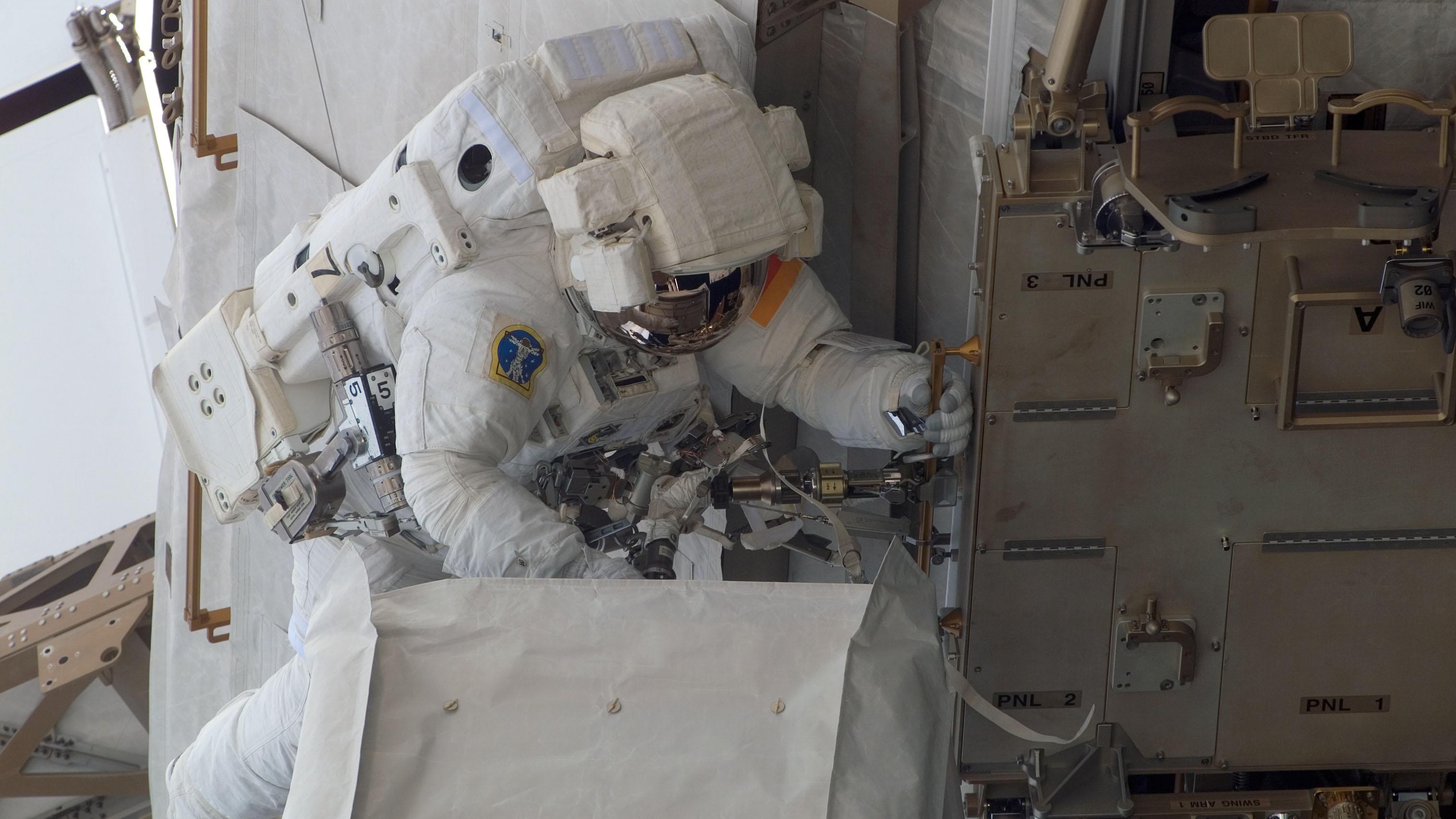 Der deutsche ESA-Astronaut Hans Schlegel bei seinem Außenbordeinsatz am 13. Februar 2008. Hauptaufgabe von Schlegel und seinem Kollegen, dem NASA-Astronauten Rex Wahlheim, war das Anbringen eines Stickstofftanks an die Internationale Raumstation ISS.
