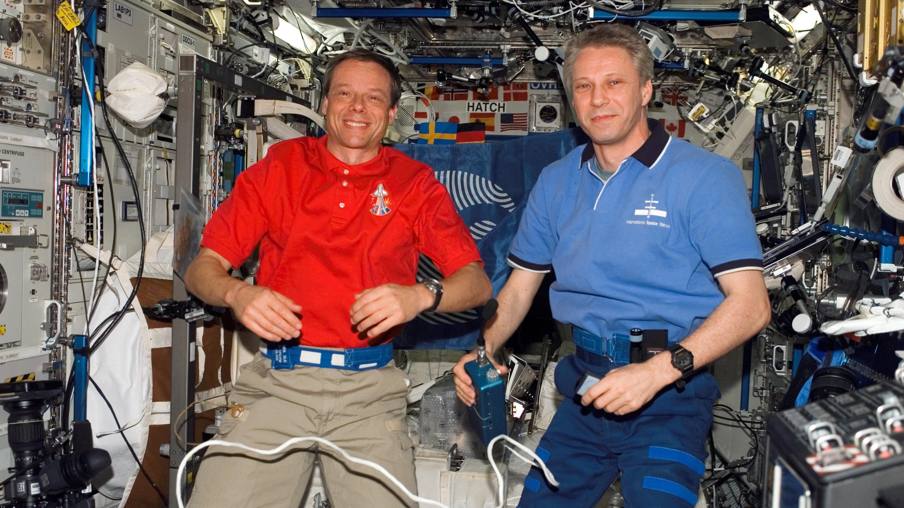 Die europäischen Astronauten Christer Fuglesang und Thomas Reiter an Bord der ISS; beide tragen die EuCPD's (European Crew Personal Dosemeter), die an den blauen Gürteln befestigt sind. Sie stammen vom DLR-Institut für Luft- und Raumfahrtmedizin.