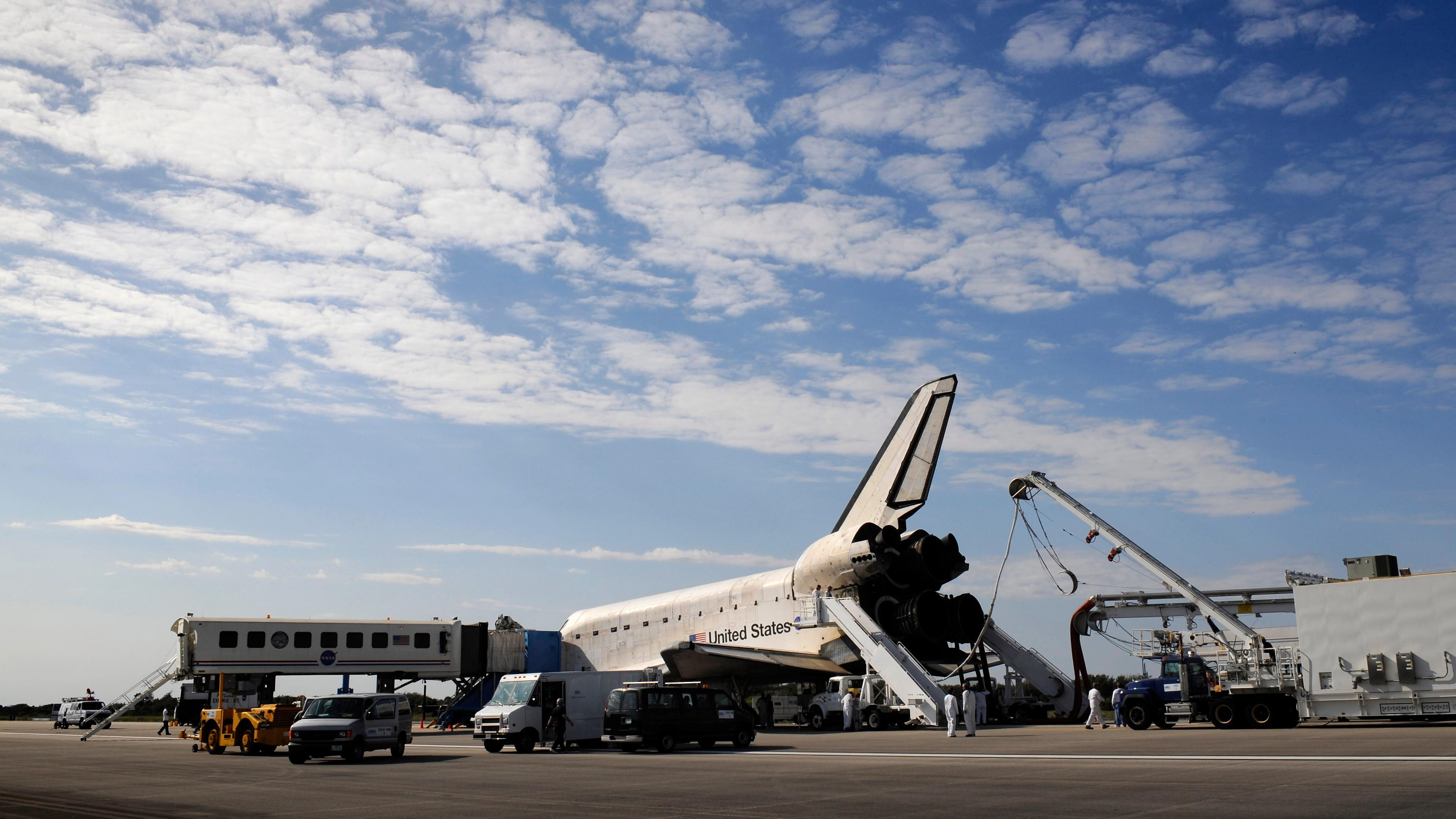 Versorgungsfahrzeuge und Betreuungspersonal für die Crew näheren sich kurz nach der Landung der Raumfähre Atlantis.