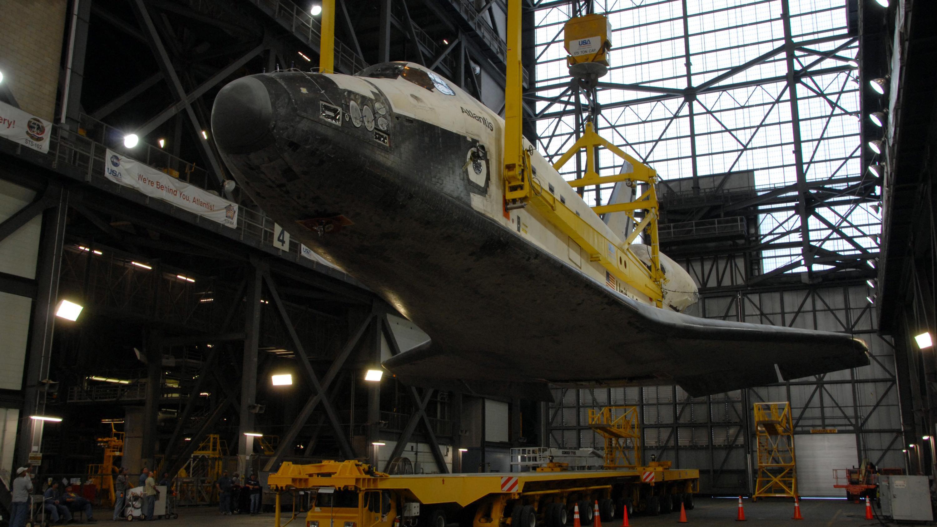Das Foto zeigt das Space Shuttle Atlantis im innern der NASA-Integrationshalle (Vehicle Assembly Building), dort wird es vom Transporter getrennt, in eine vertikale Position gebracht und anschließend mit dem Außentank und den Treibstofftanks verbunden.