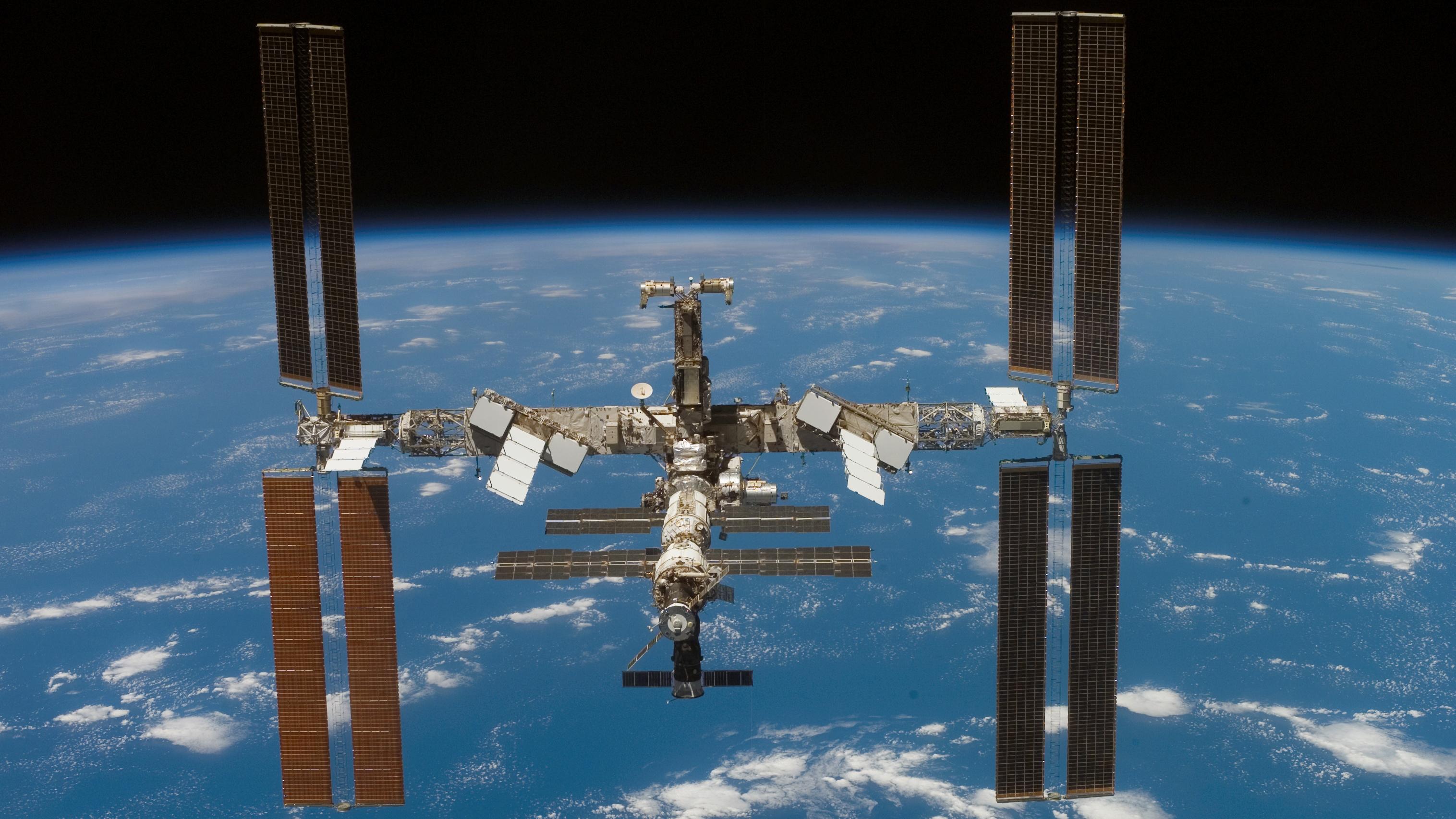 Die Internationale Raumstation ISS zwischen Weltraum und Erde. Die Aufnahme wurde während der Mission STS-117, nach dem Abdocken von Space Shuttle Atlantis, am 19. Juni 2007 aufgenommen.