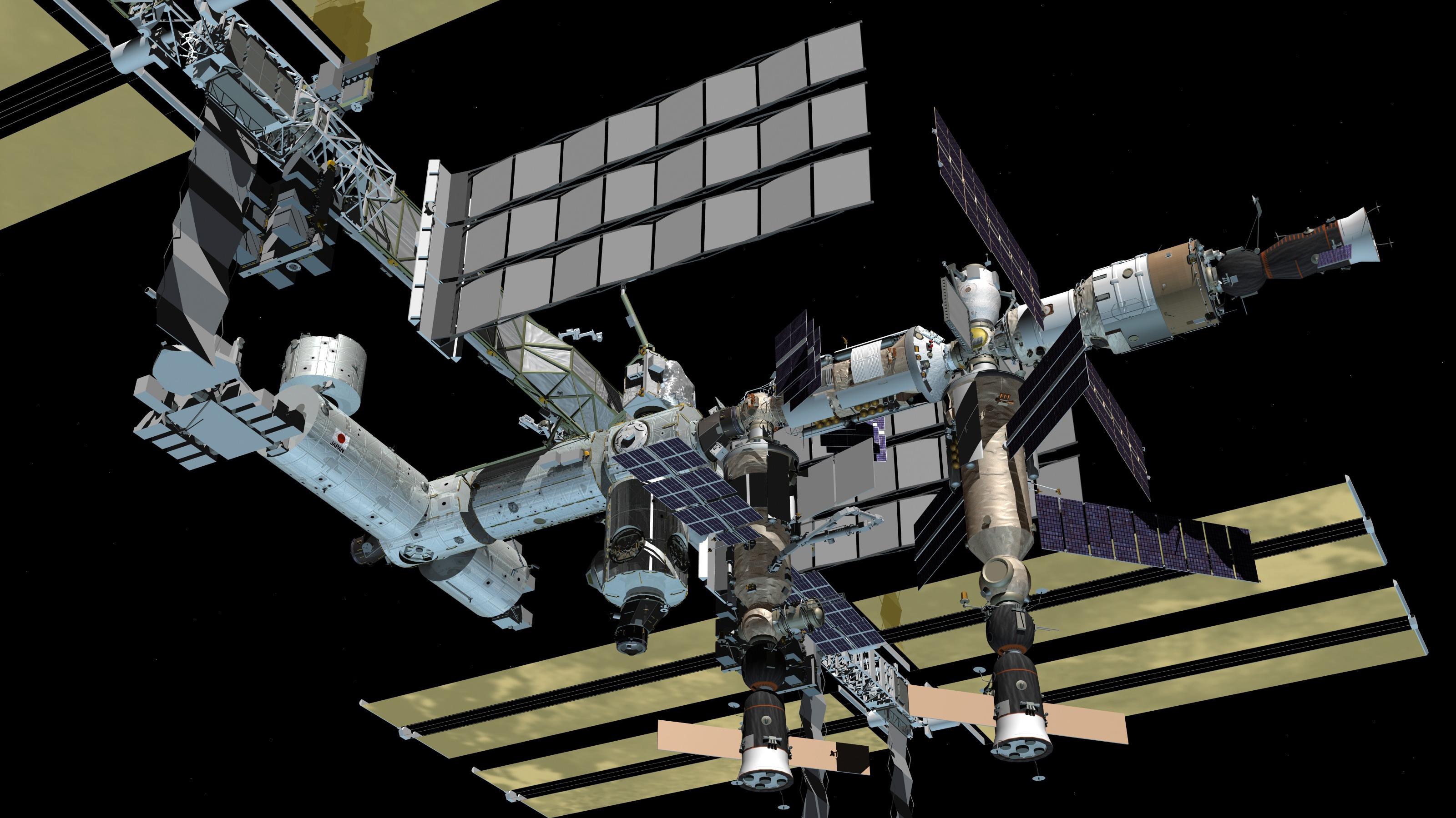 Die Computergrafik zeigt eine Nahaufnahme der Internationalen Raumstation ISS, nach der Fertigstellung.