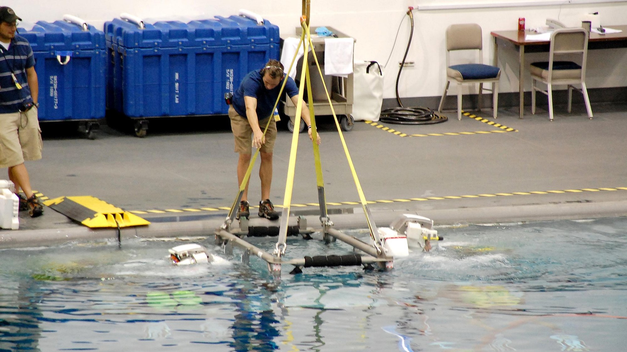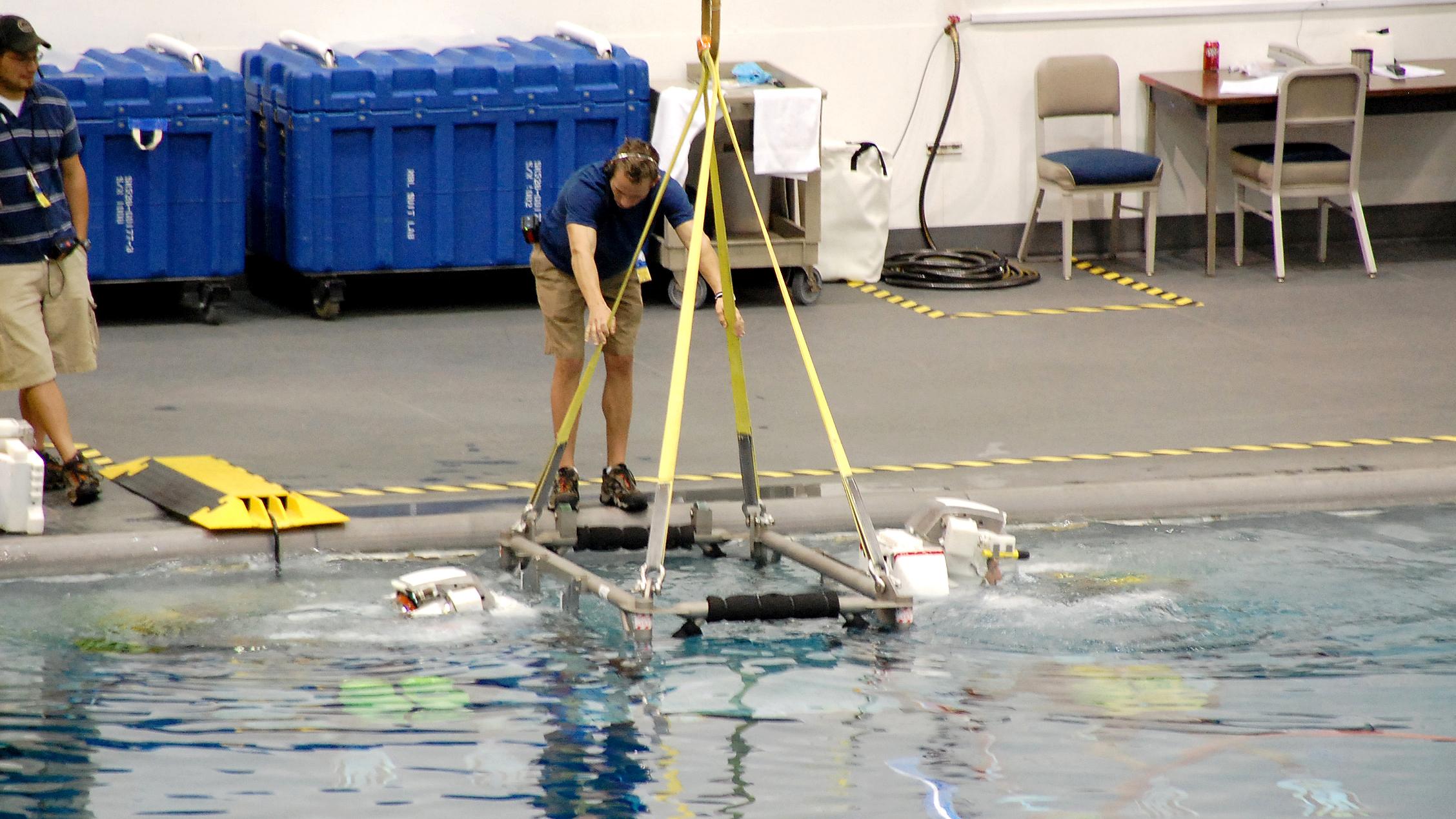 Neutral Buoyancy Laboratory: Einstieg zum Training. Auf einer gesicherten Plattform werden die Astronauten für ein Unterwassertraining zu Wasser gelassen.