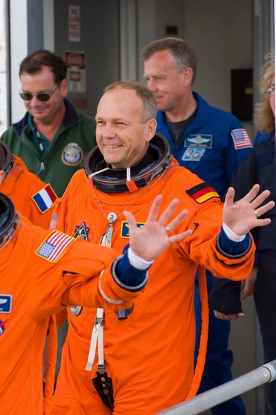 Hans Schlegel im orangefarbenen Raumanzug auf dem Weg zum Start. Sieben Astronauten starteten am 7. Februar 2008 mit der Raumfähre Atlantis zur ISS. Mit der Mission STS-122 brachten sie das europäische Weltraumlabor Columbus zur Internationalen Raumstation ISS.