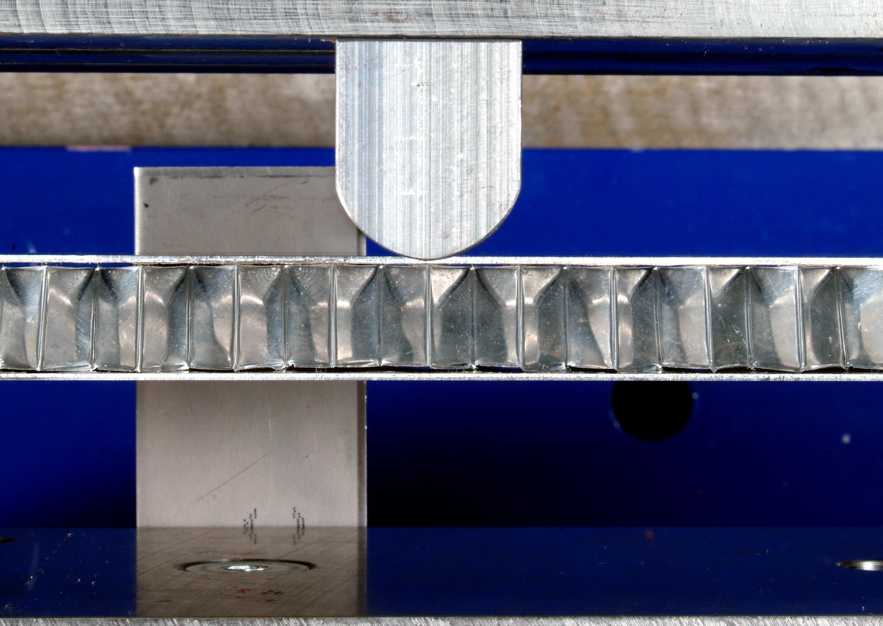 Sandwichstruktur mit neuartigem Faltwaben-Kern im Belastungstest.
