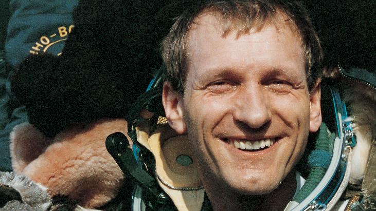 Landung der Sojus-TM 13 am 25. März 1992 um 9.51 Uhr MEZ im Zielgebiet bei Archalik in Nordkasachstan. Der Daumen zeigt nach oben: Ein gut gelaunter Astronaut Klaus-Dietrich Flade nach erfolgreicher Rückkehr von der Raumstation MIR.