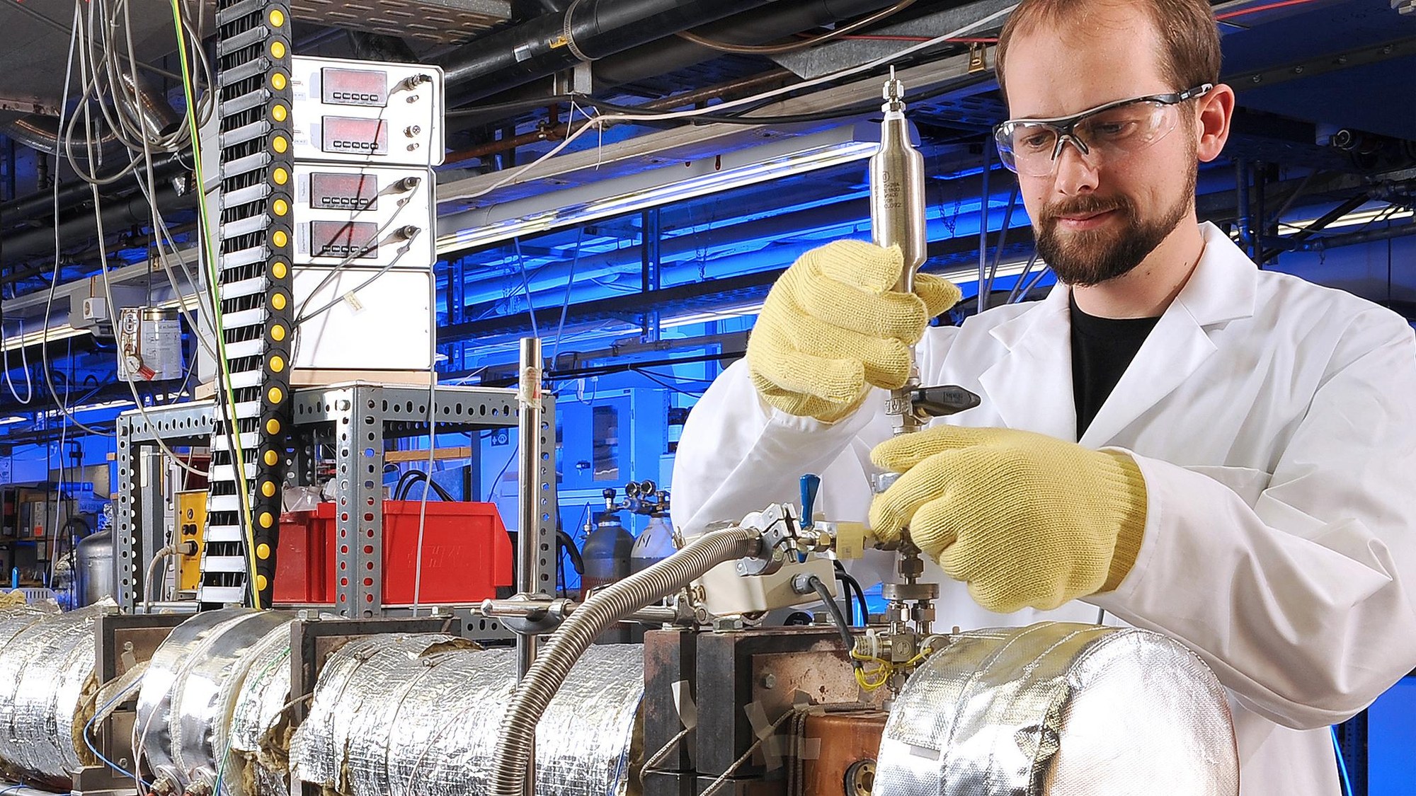 Forschung an neuen Treibstoffen: Verbrennungsforscher Dominik Schuler an einer Stoßwellenrohranlage im DLR-Institut für Verbrennungstechnik, einem idealen Prüfstand zur Erzeugung hoher Temperaturen und Drücke, wie sie zum Beispiel in einer Fluggasturbine unter Volllast ("Take-Off") herrschen. Ziel der Wissenschaftler ist es, den Verbrennungsprozess in Hinblick auf Schadstoffemissionen und Zuverlässigkeit zu optimieren.
