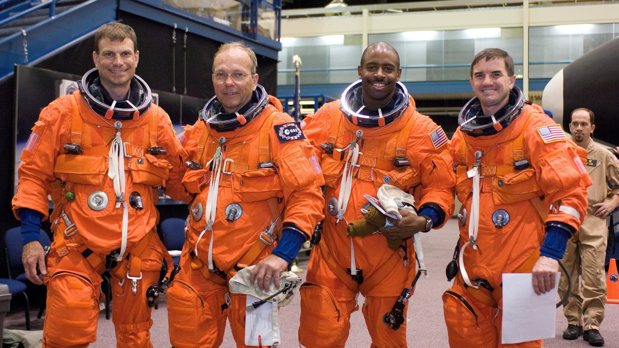Die Astronauten Stanley G. Love, Hans Schlegel, Leland D. Melvin und Rex J. Walheim (v.r.n.l) während einer Trainingseinheit im Johnson Space Center in Houston, Texas