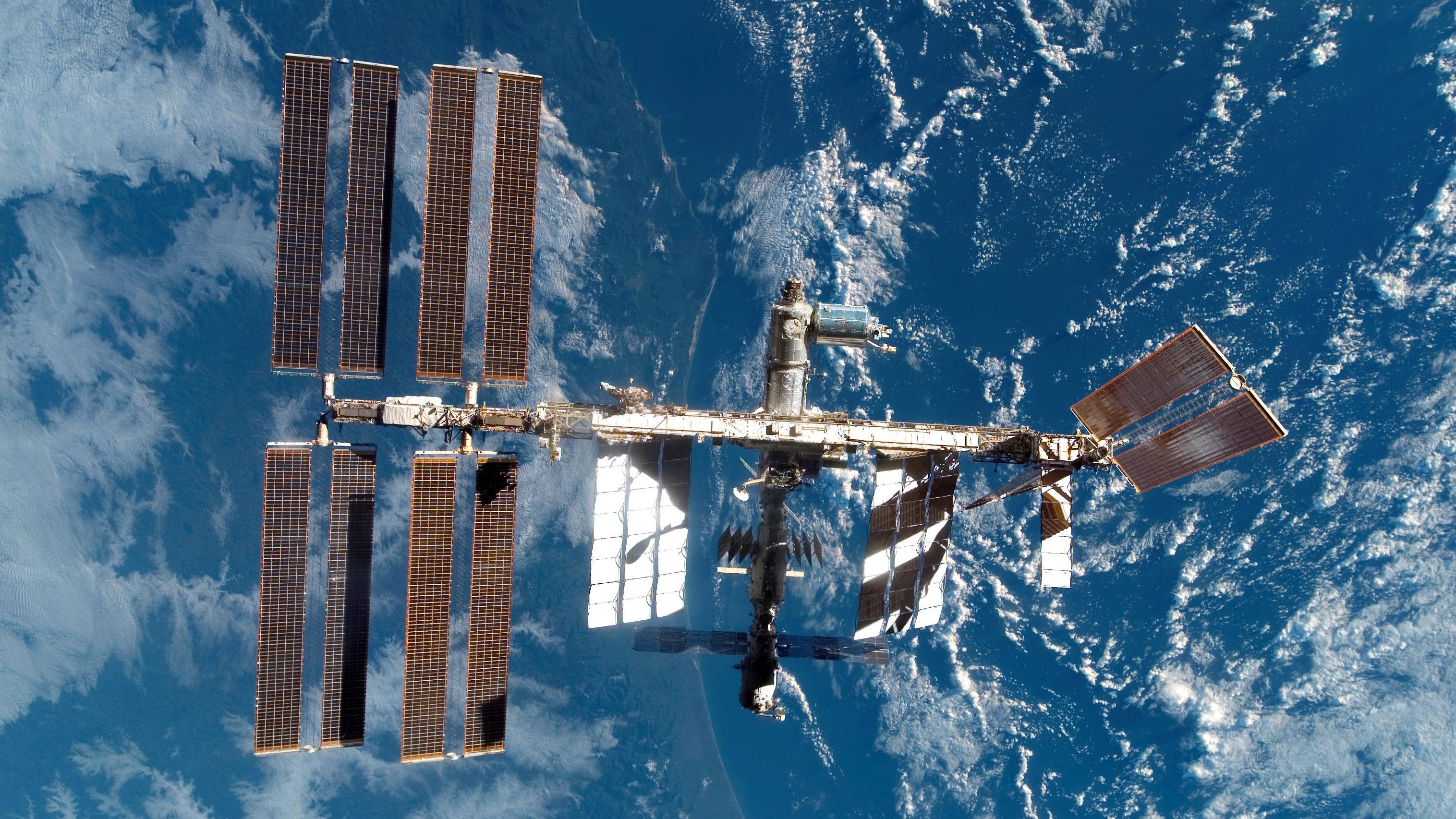 ISS im Februar 2008 mit der Erde im Hintergrund