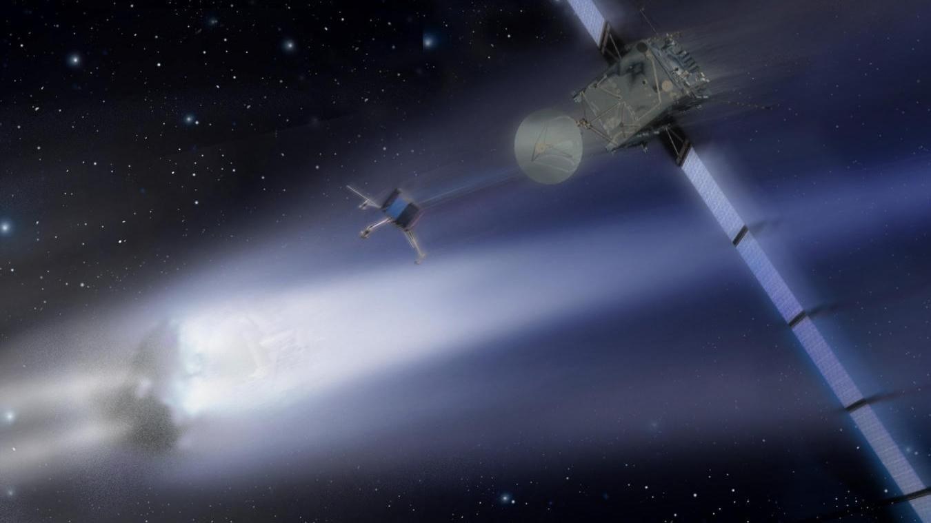 Künstlerische Darstellung der Sonde Rosetta, von der sich der Philae-Lander abgetrennt hat, um auf dem Kometen zu landen.