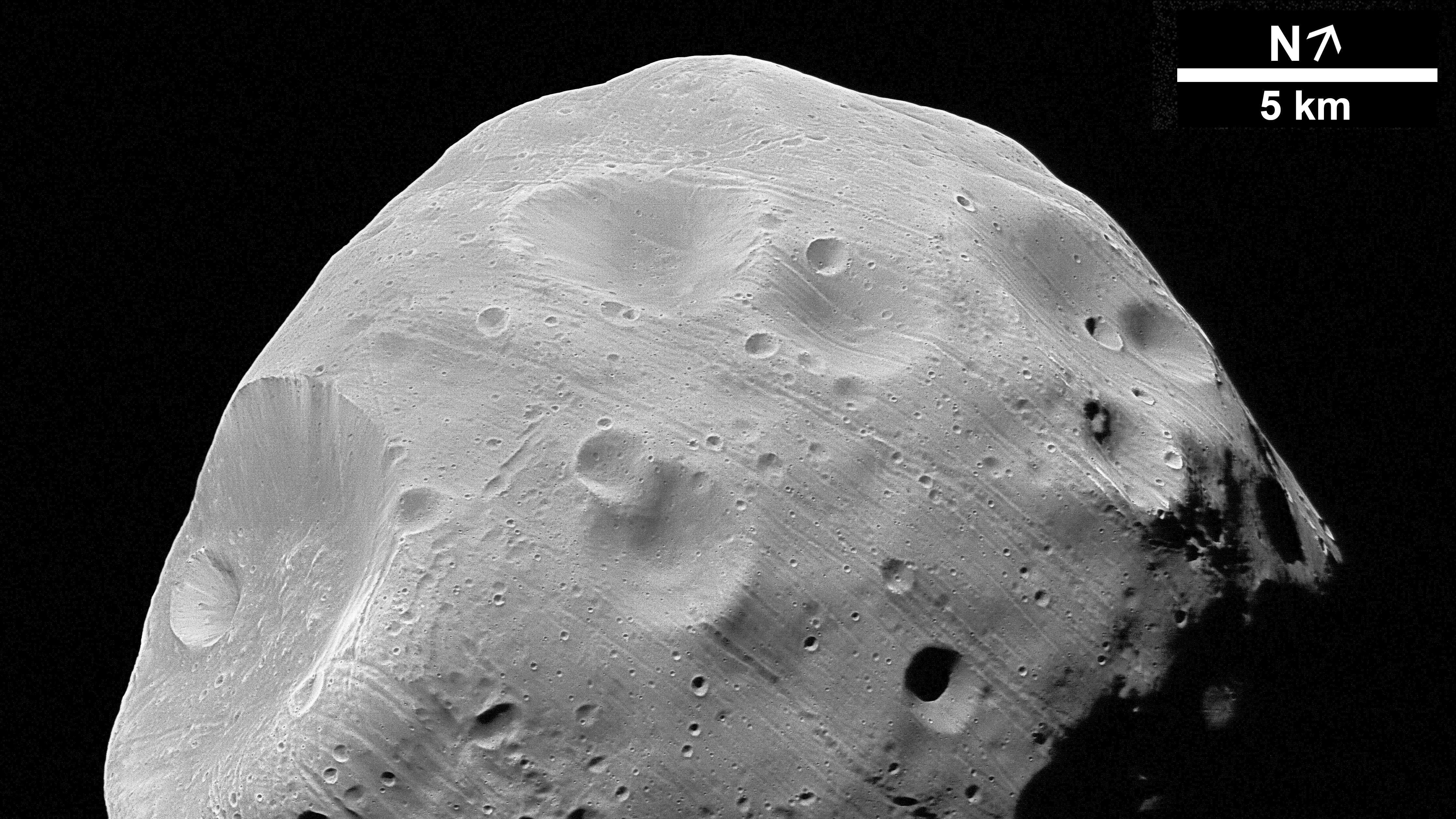 Schwarzweiß-Ansicht des Mars-Mondes Phobos. Auffallend ist das parallele Muster der Furchen auf Phobos. Es scheint die dem Mars zugewandte Seite zwischen Äquator und Nordpol vollständig zu überziehen, wobei die Abstände zwischen den Furchen sehr regelmäßig sind. Sie durchschneiden die meisten größeren Krater. Die Frage nach dem Ursprung der Furchen konnte noch nicht geklärt werden. Es könnte sich um "Schrammen" handeln, die durch Gesteinsbrocken, die den Mond getroffen haben, entstanden sind, oder sie sind das Ergebnis von starken Gezeiten-Wechselwirkungen mit dem Mars. Diese könnten tektonische Kräfte verursacht haben, die zu Spannungen im Inneren des Mondes führten.