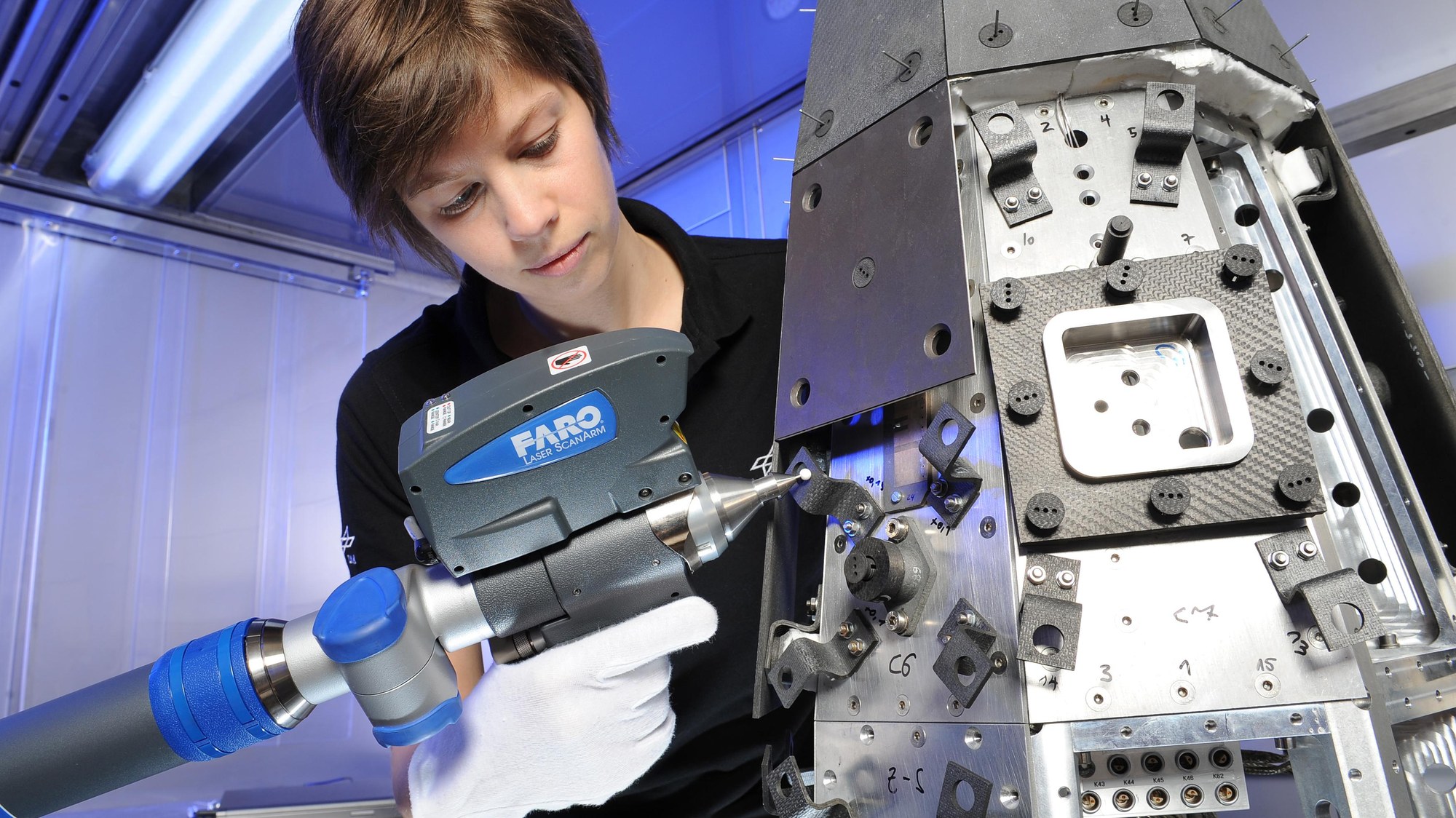 Henning Elsässer montiert die keramischen Hitzeschutzkacheln. Der Wissenschaftler beschäftigt sich im DLR-Institut für Bauweisen- und Konstruktionsforschung mit der Auslegung und Integration der Nutzlastspitze sowie dem Bau des Hitzeschilds des SHEFEX-II-Körpers. Am Institut wird die Faserverbundkeramik entwickelt, die hier zur Anwendung kommt. Durch die Entwicklung neuartiger Werkstoffe, die auch im Temperaturbereich über 1500 Grad Celsius hohe Festigkeit aufweisen, wird der Einsatz von scharfkantigen Fahrzeugen im Hyperschall überhaupt erst möglich.