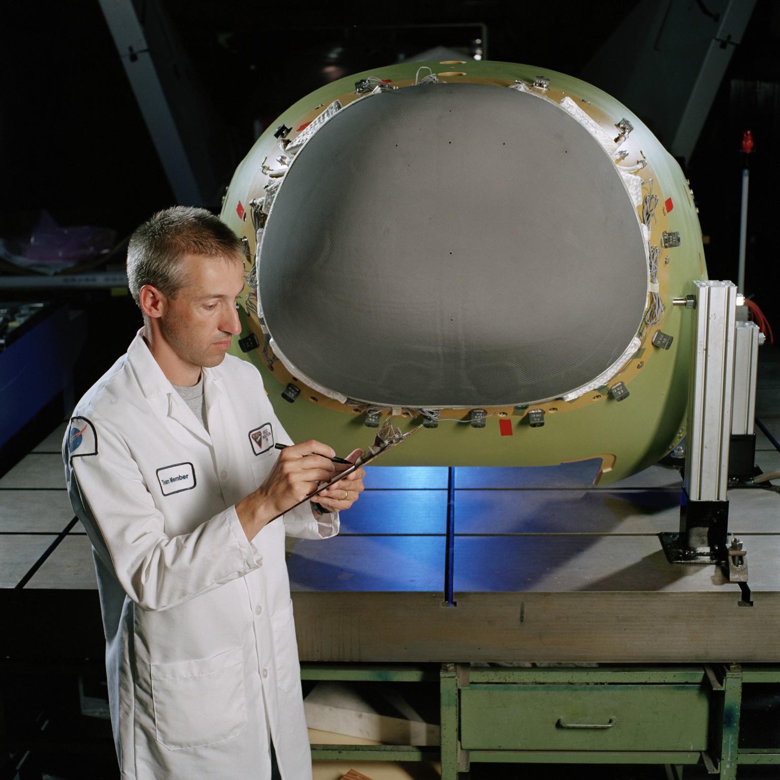 Thomas Reimer arbeitet an der Nasenkappe nach der Integration an X-38 in Houston im Oktober 2001.