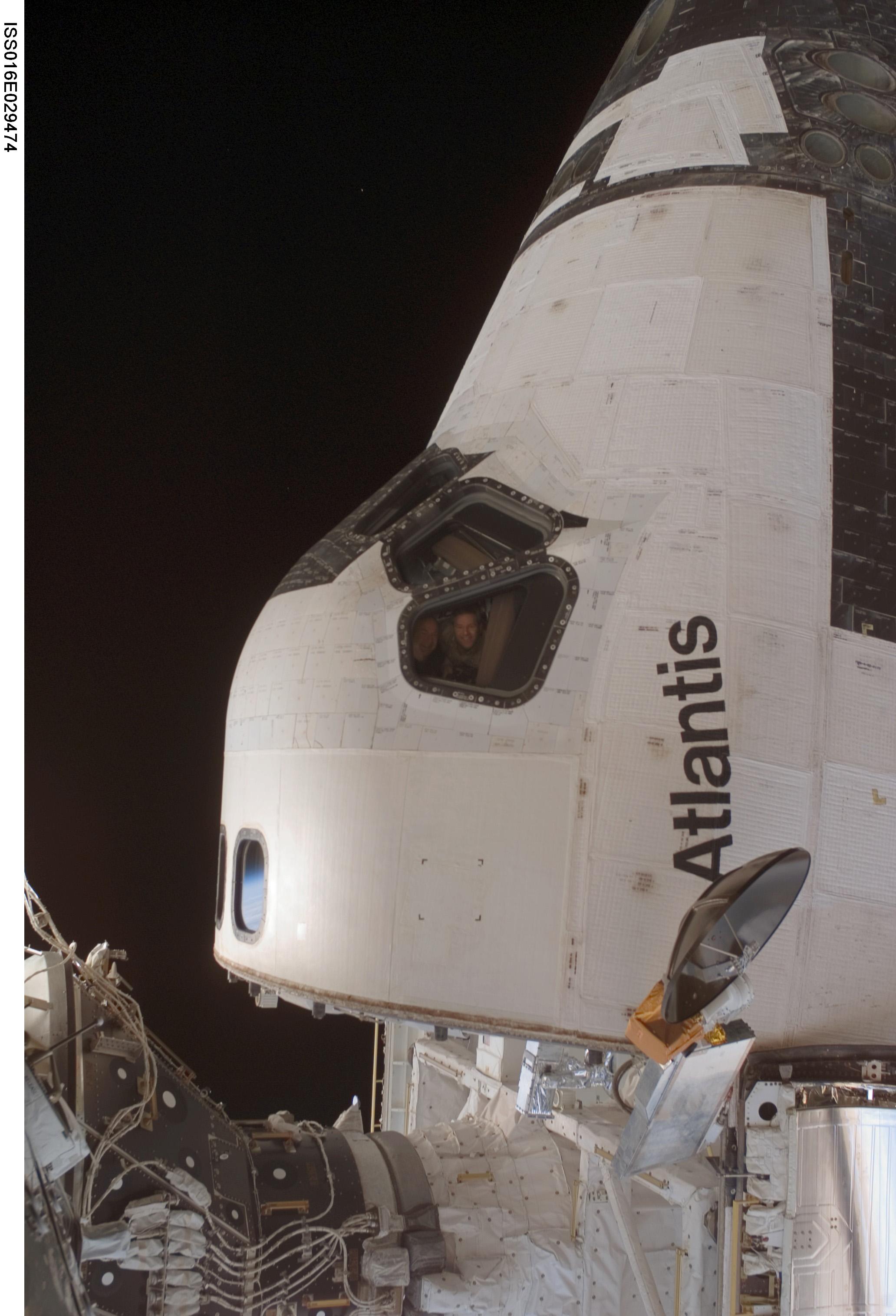 Die Raumfähre Atlantis war während der Columbus-Mission zehn Tage lang an die Internationale Raumstation ISS angedockt. Am Fenster der Atlantis ist NASA-Astronaut Steve Frick zu sehen, Kommandant der Shuttle-Mission, die das Raumlabor Columbus ins All gebracht hat.