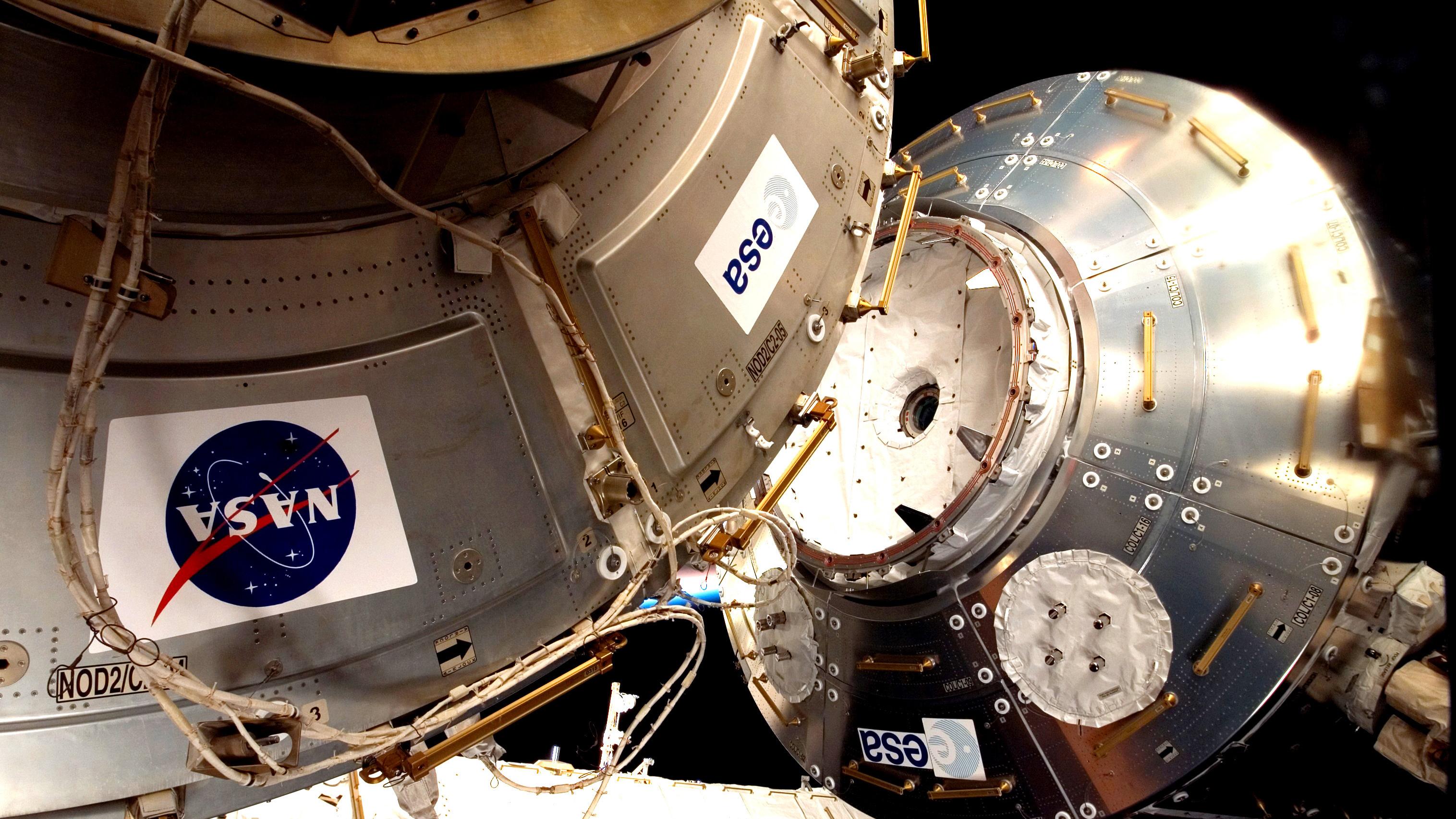 Das Forschungslabor Columbus auf dem Weg zu seinem neuen Bestimmungsort, der rechten Öffnung des Harmony-Moduls (Node 2). Das Columbus-Labor wurde am 11. Februar 2008 an der Internationalen Raumstation ISS montiert.