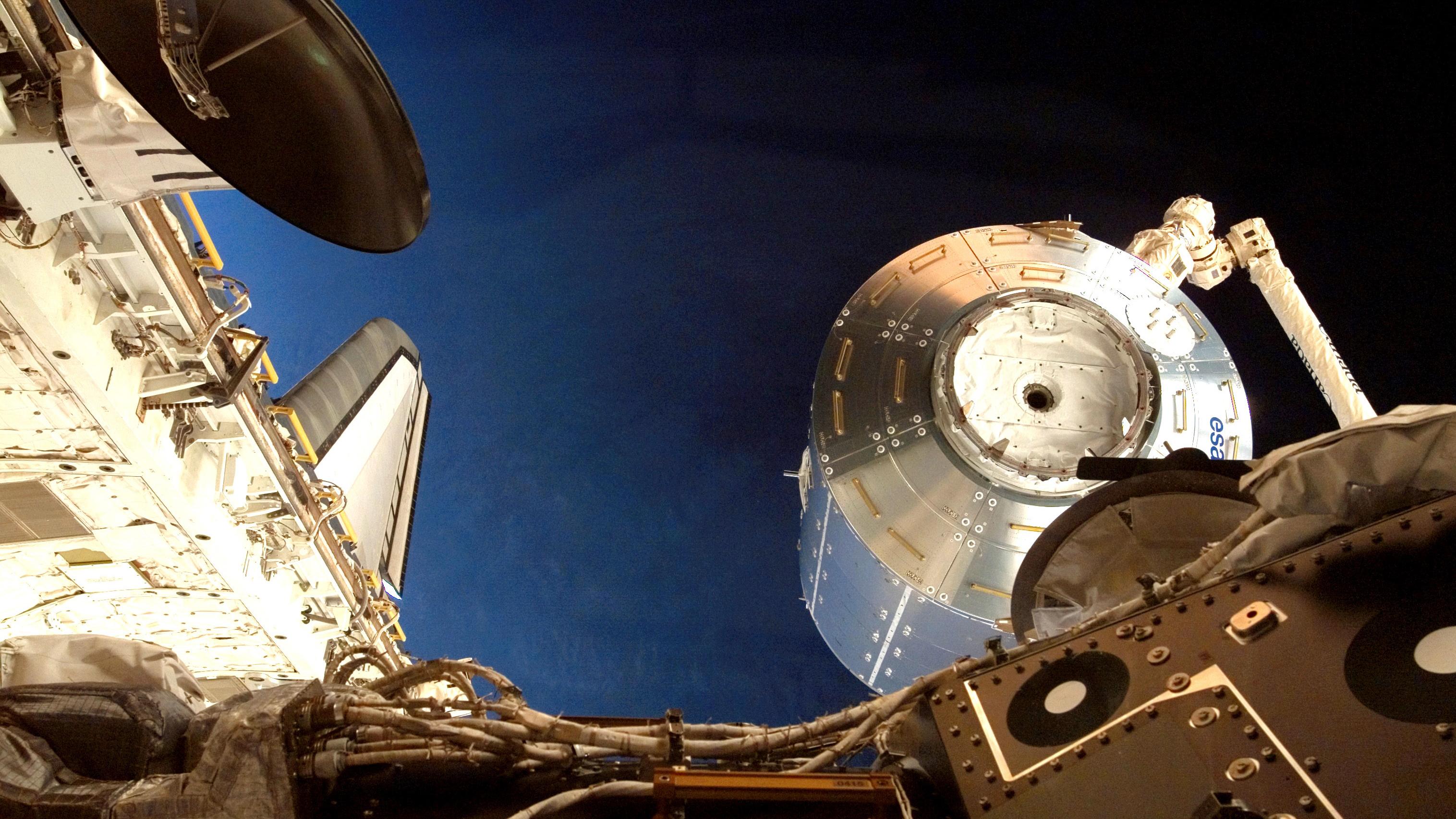 Blick aus der Raumfähre Atlantis auf das europäische Raumlabor Columbus, das am Roboterarm der Internationalen Raumstation an seinen Platz auf der ISS bewegt wird. Das Raumlabor startete am 7. Februar 2008 ins All und wurde am 11. Februar montiert.