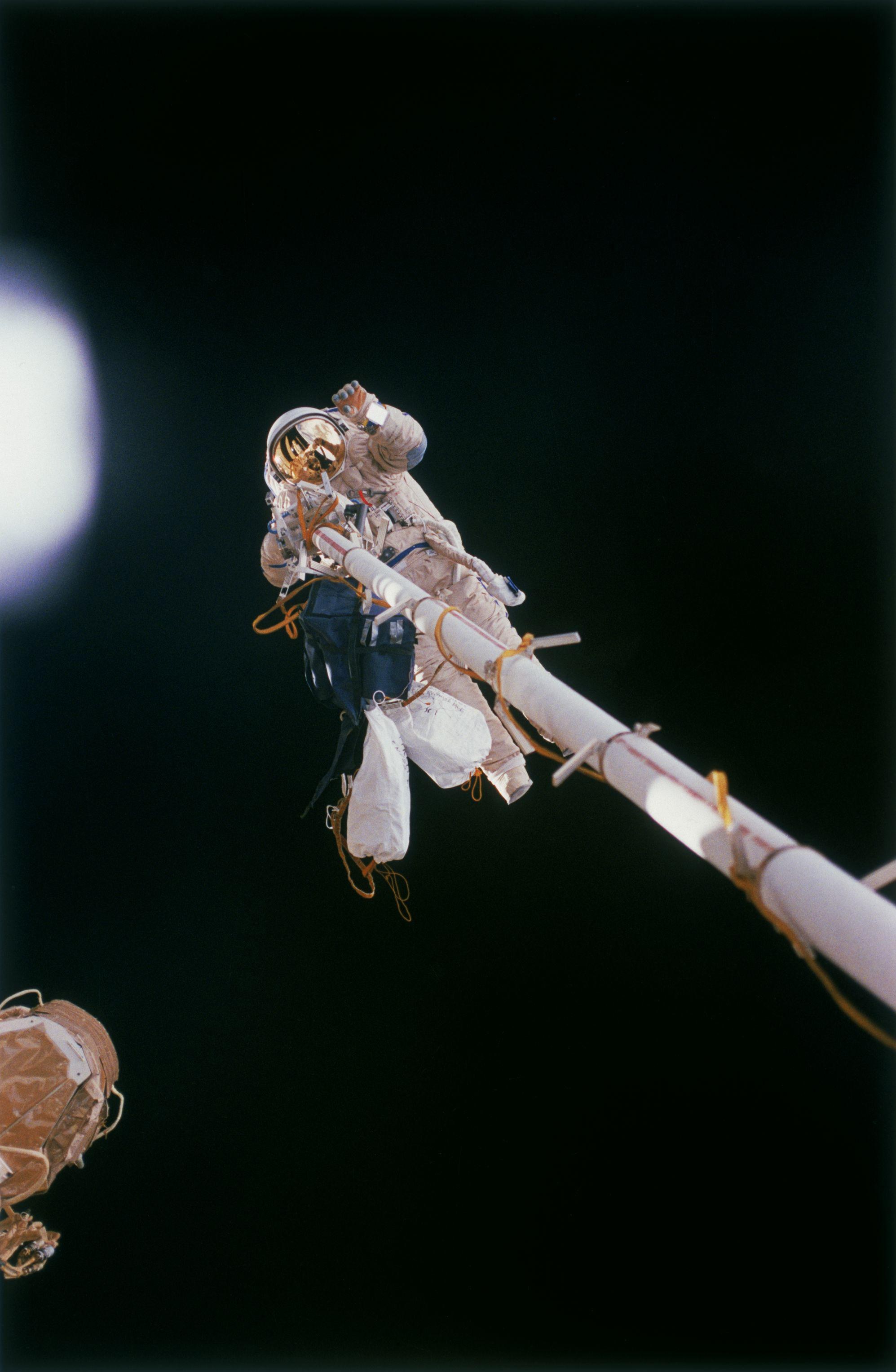 Thomas Reiter befindet sich am STRELA-Kran der Raumstation Mir während des ersten Außenbordeinsatzes (EVA) am 20. Oktober 1995.