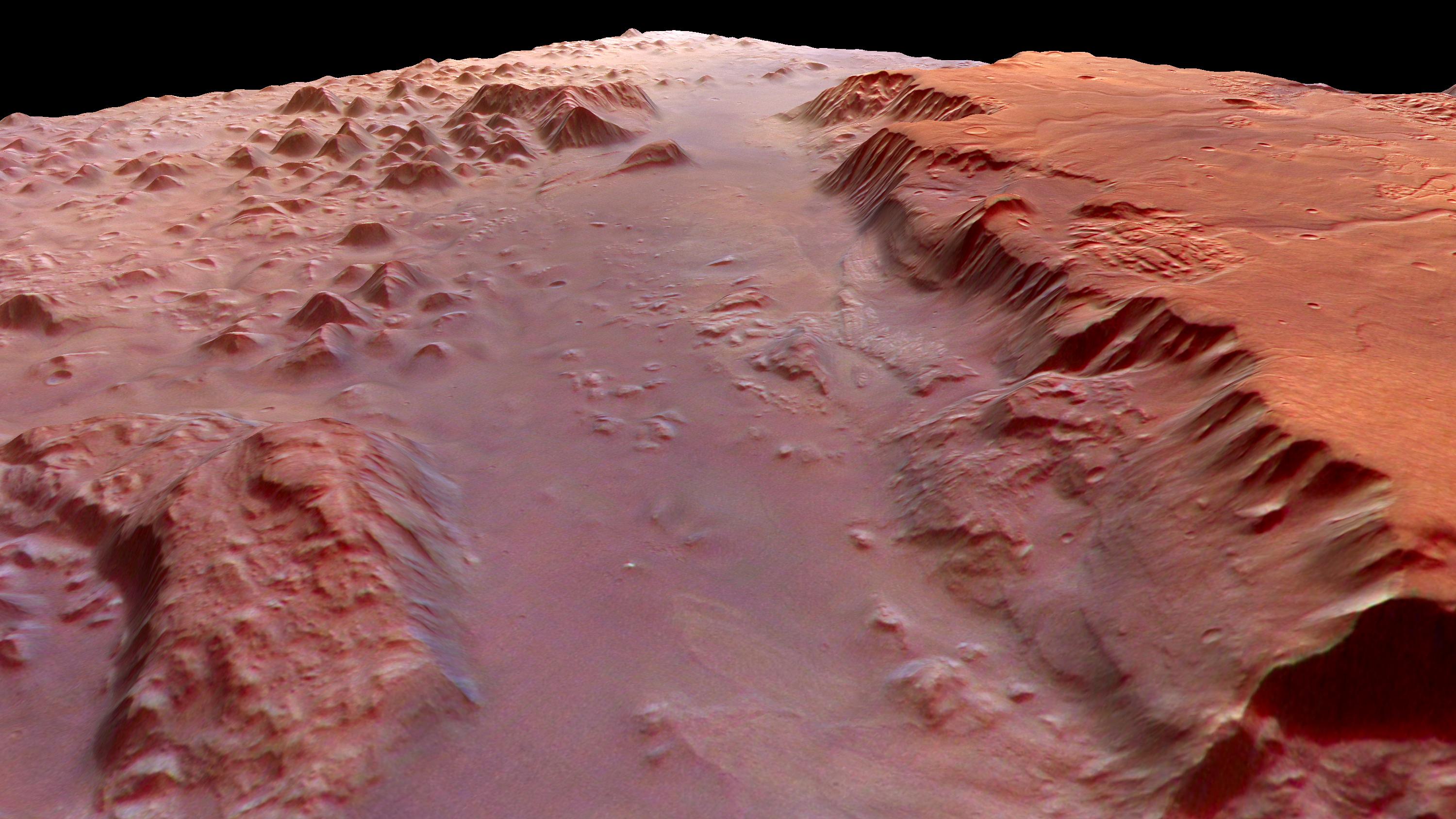In der Talenge Eos Chasma verengt sich der große Mars-Canyon Valles Marineris an seinem östlichen Ende und ist nur durch zwei schmale Schluchten im Hochland mit den großen, nach Norden umbiegenden Ausflusstälern verbunden. Die hier zu sehende "Schlucht der Morgenröte", das Eos Chasma, ist der südliche der beiden Durchgänge, Capri Chasma der nördliche.