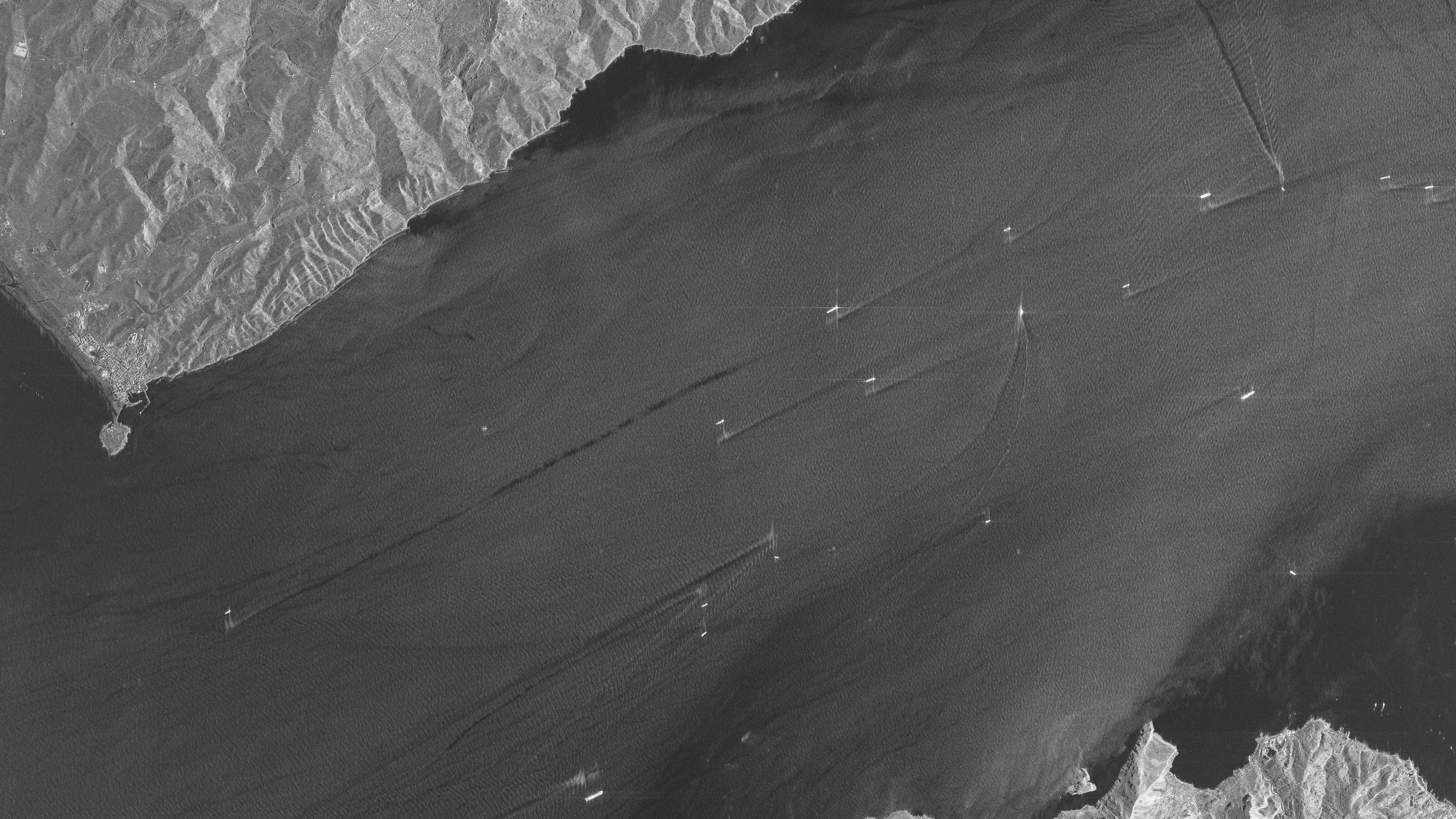 In der Bildmitte ist die Strasse von Gibraltar zu sehen - das Tor zwischen Atlantik und Mittelmeer. Die zahlreichen hellen Punkte repräsentieren Schiffe und dokumentieren, wie stark die Meerenge befahren ist. Auf der Nordseite liegt Gibraltar, gegenüber auf der Südseite Marokko. Ebenfalls auf der spanischen Nordseite ragt eine Insel in den Atlantik - ein der Stadt Tarifa vorgelagertes Stück Festland, der südlichste Punkt des europäischen Festlandes. Die Daten von TerraSAR-X werden in naher Zukunft zur Überwachung des Schiffsverkehrs sowie zum Aufdecken von Verschmutzungen der Meere mit Öl beitragen. Darüber hinaus wird TerraSAR-X auch Ozeanographen unterstützten, beispielsweise bei der Ermittlung von Strömungsgeschwindigkeiten.