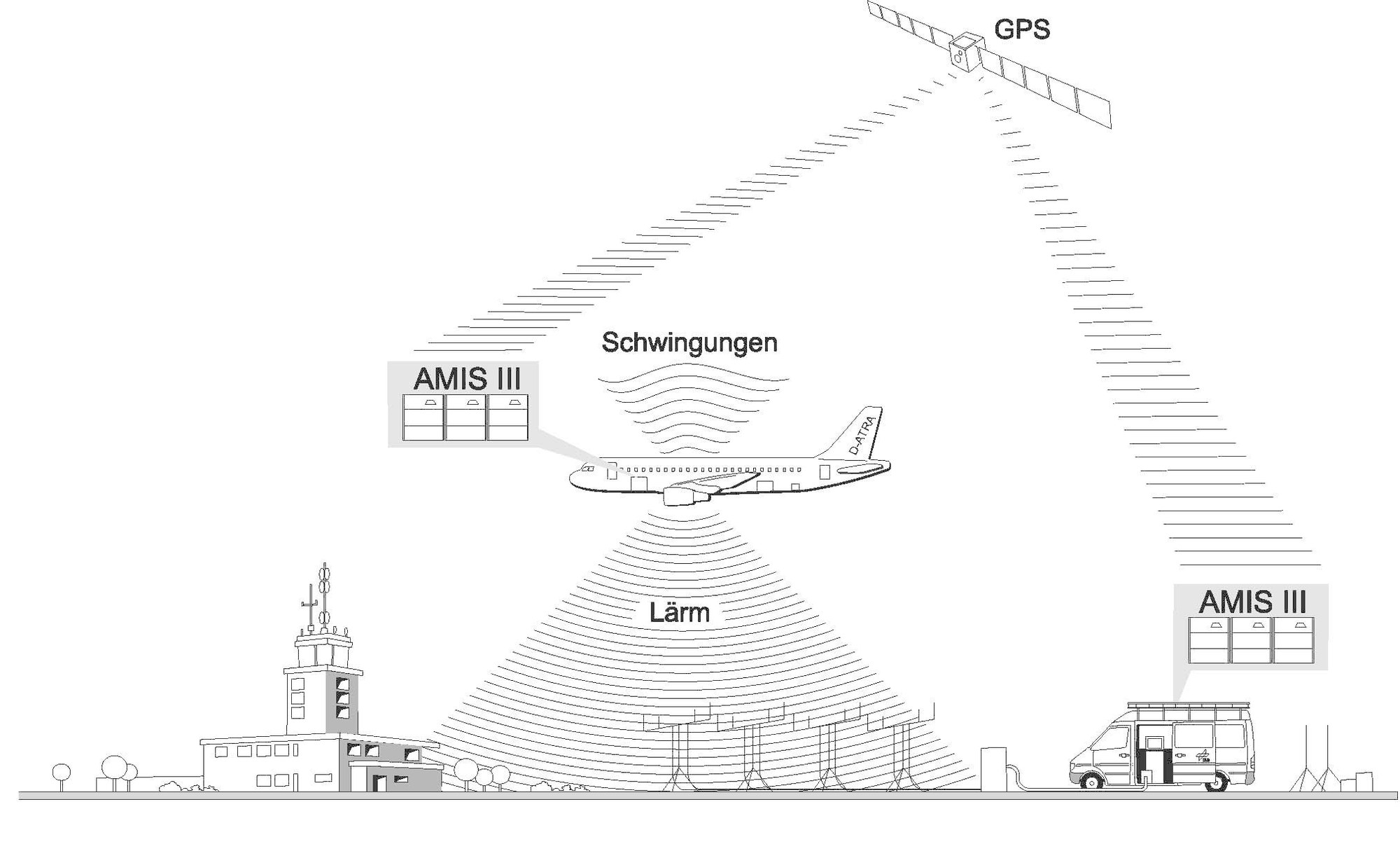 Da verschiedene Teile der neuen AMIS-III-Messanlage über größere Distanzen hinweg vollsynchron Daten erfassen können, kann ein Teil der Anlage in einem Flugzeug fliegen und Schwingungsdaten aufnehmen, während gleichzeitig der andere Teil am Boden den Schall misst, der durch die Schwingungen entsteht.