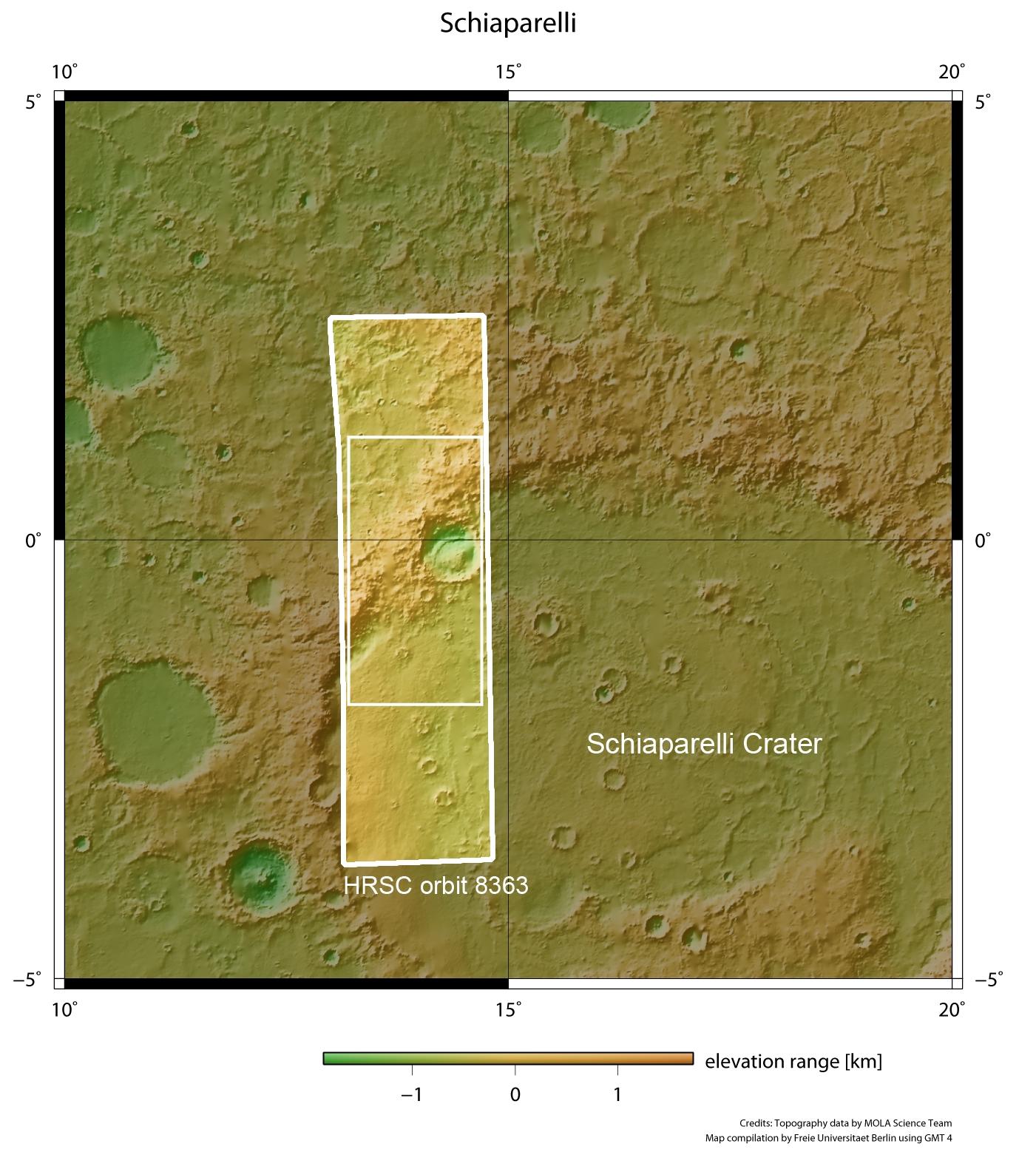 Die vom Deutschen Zentrum für Luft- und Raumfahrt (DLR) auf der ESA-Raumsonde Mars Express betriebene hochauflösende Stereokamera HRSC nahm am 15. Juli 2010 im Orbit 8363 den Westteil des Schiaparelli-Krater mit einer Auflösung von rund 19 Metern pro Bildpunkt auf (dünn umrandeter Streifen). Die Abbildungen zeigen hiervon einen Ausschnitt bei 0 Grad Breite und 14 Grad östlicher Länge (dick umrandetes Rechteck).