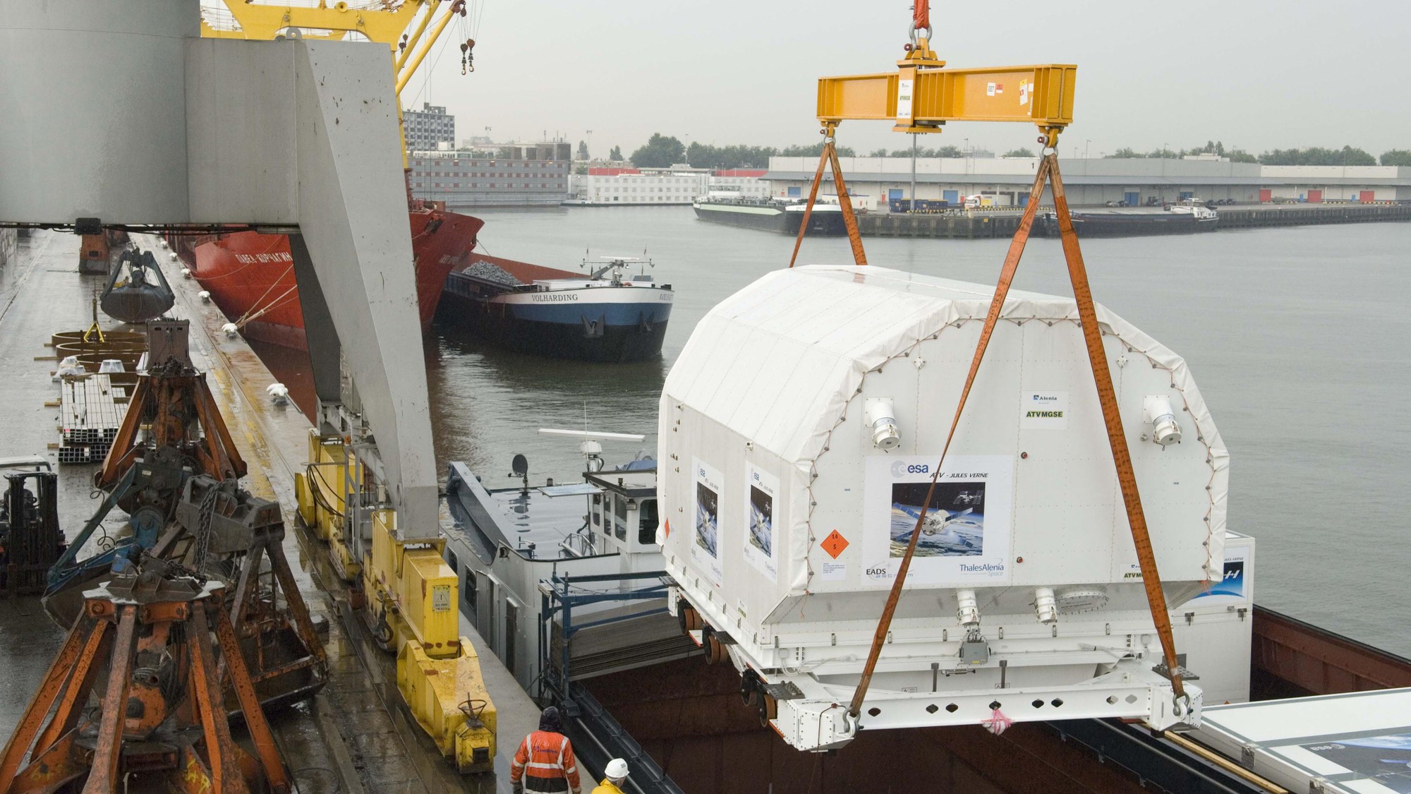 Das ATV auf dem Weg von Europa zum europäischen Raumflughafen in Kourou in Französisch-Guyana, wird hier im Hafen von Rotterdam umgeladen.
