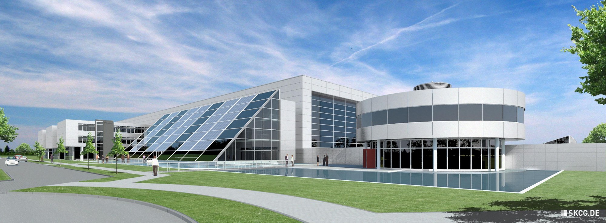 Gesamtansicht des umfangreichen Gebäudekomplexes des CFK-NORD in Stade. Einen großen Bereich darin nimmt das neue DLR-Zentrum für Leichtbauproduktionstechnologie (ZLP) ein. Die neue Einrichtung ist ein wichtiger Schritt zur starken Etablierung von Faserverbundwerkstoffen im Flugzeugbau.