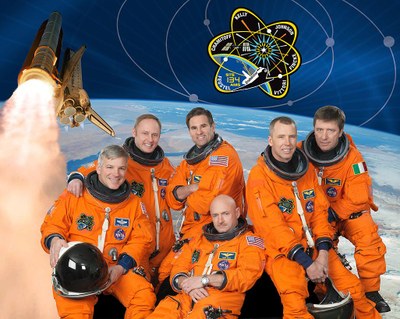 Die Mitglieder der STS-134-Mission mit den NASA-Astronauten Mark Kelly (Kommandant, vorne Mitte), Gregory H. Johnson (Pilot) und den Missionsspezialisten Michael Fincke, Greg Chamitoff, Andrew Feustel und dem ESA-Astronauten Roberto Vittori (von links nach rechts).