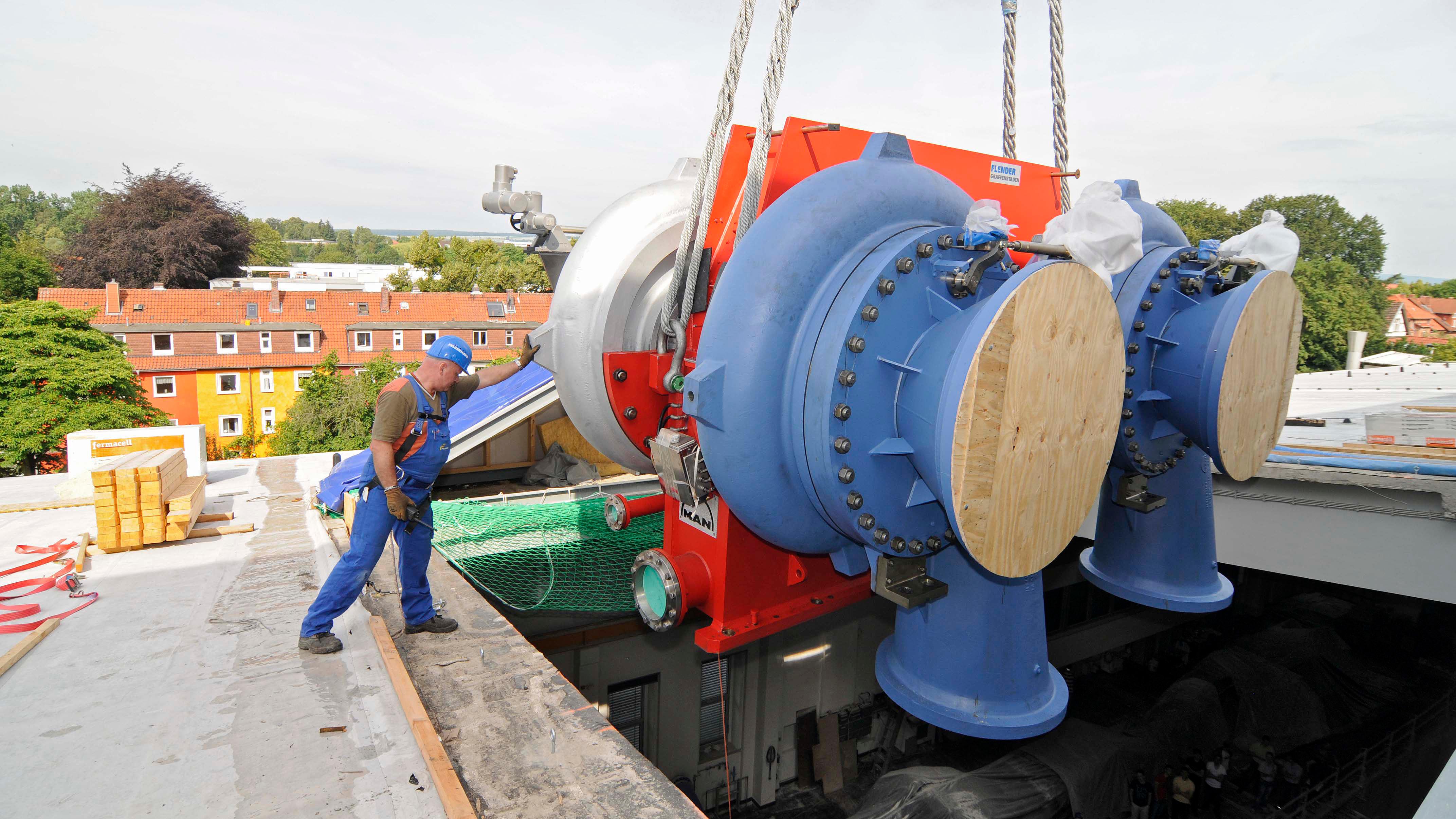 Der 77 Tonnen schwere Verdichter wurde durch ein geöffnetes Dach in ein Versuchsgebäude eingesetzt. Die Maschine soll künftig wie eine riesige Luftpumpe einen neuen Turbinenprüfstand antreiben, in dem an den Turbinen für die Flugzeuge und Kraftwerke der Zukunft geforscht wird.