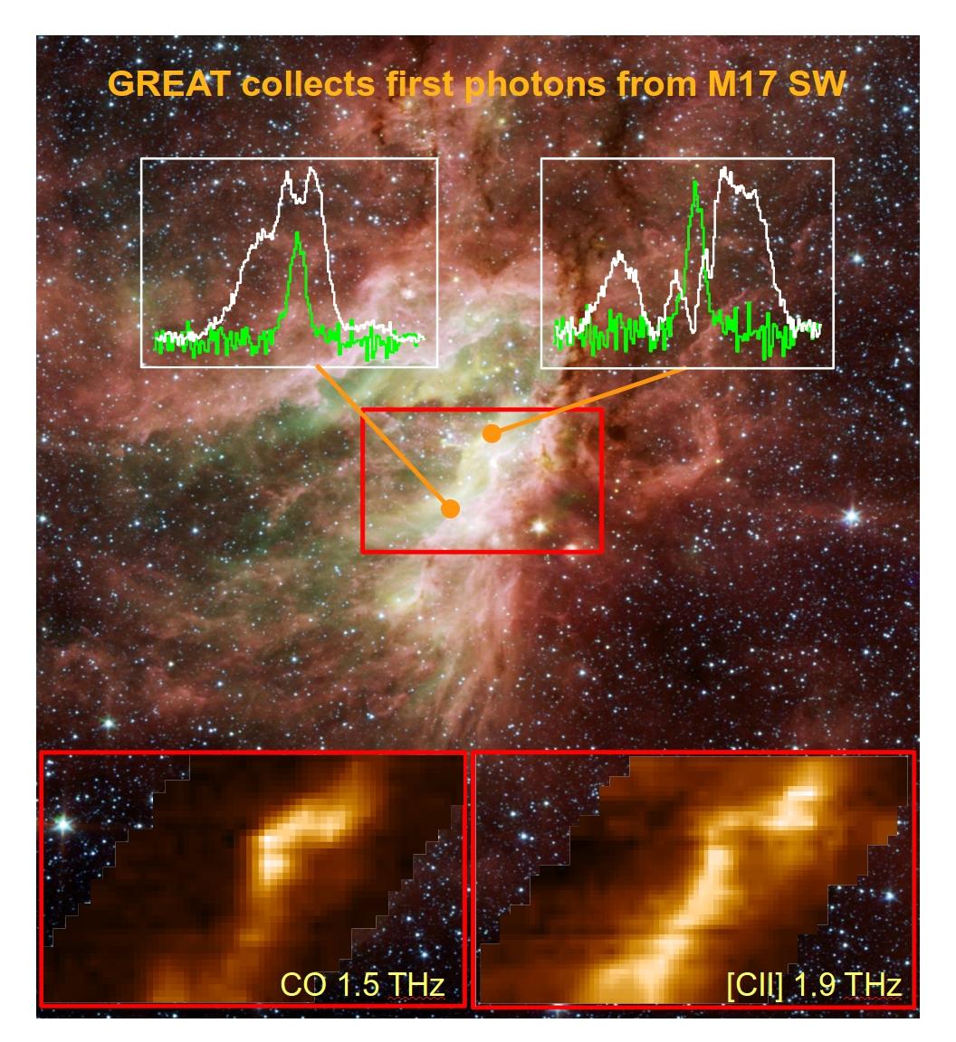 Das GREAT-Instrument hat am 6. April 2011 die ersten Terahertz-Photonen aus der Sternentstehungsregion M17SW aufgenommen. Ausgewählte Spektren von ionisiertem Kohlenstoff ([CII], weiße Linie) und warmem Kohlendioxid (CO, grüne Linie) werden als Überlagerung auf ein Falschfarbenbild im Nahinfrarotbereich, gemessen mit dem Weltraumteleskop Spitzer (NASA/JPL-Caltech/M. Povich, Univ. Wisconsin), gezeigt. Die hohe spektrale Auflösung von GREAT ist erforderlich, um die Geschwindigkeitsstruktur entlang der Wolke anhand der Linienprofile zu untersuchen. Der vermessene Bereich ist in Rot markiert und die über die Geschwindigkeit integrierte Verteilung von [CII] and CO wird in den unteren beiden Einblendungen gezeigt. Mit den GREAT-Daten wird die Übergangsregion erforscht, in der die Molekülwolke der ionisierenden Strahlung durch massereiche Sterne ausgesetzt ist.
