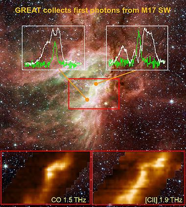 Das GREAT-Instrument hat am 6. April 2011 die ersten Terahertz-Photonen aus der Sternentstehungsregion M17SW aufgenommen. Ausgewählte Spektren von ionisiertem Kohlenstoff ([CII], weiße Linie) und warmem Kohlendioxid (CO, grüne Linie) werden als Überlagerung auf ein Falschfarbenbild im Nahinfrarotbereich, gemessen mit dem Weltraumteleskop Spitzer (NASA/JPL-Caltech/M. Povich, Univ. Wisconsin), gezeigt. Die hohe spektrale Auflösung von GREAT ist erforderlich, um die Geschwindigkeitsstruktur entlang der Wolke anhand der Linienprofile zu untersuchen. Der vermessene Bereich ist in Rot markiert und die über die Geschwindigkeit integrierte Verteilung von [CII] and CO wird in den unteren beiden Einblendungen gezeigt. Mit den GREAT-Daten wird die Übergangsregion erforscht, in der die Molekülwolke der ionisierenden Strahlung durch massereiche Sterne ausgesetzt ist.